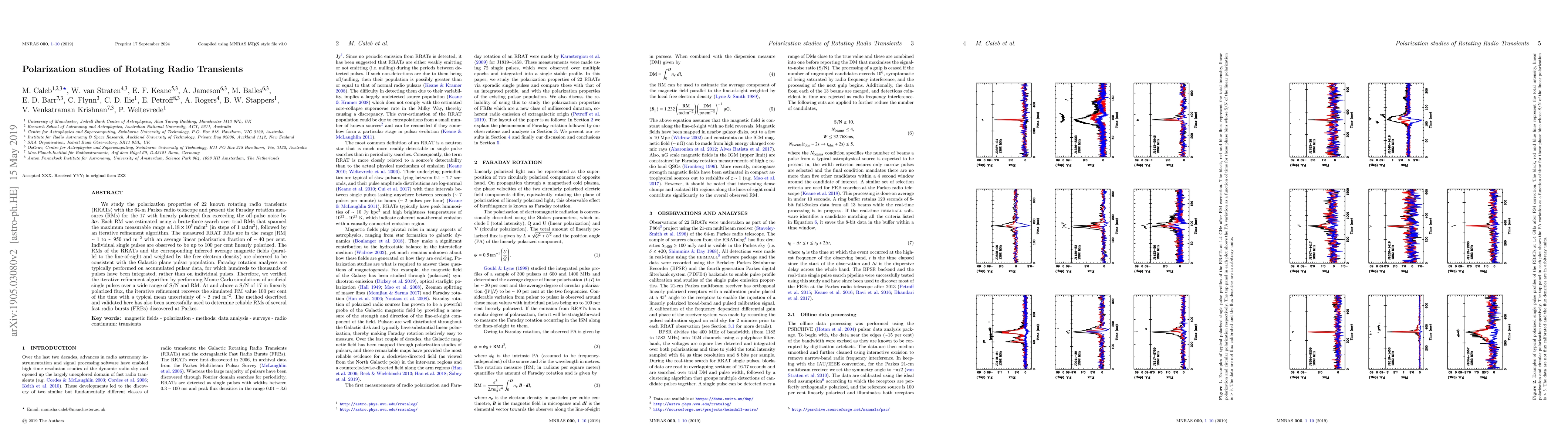 This study investigates the polarization properties of 22 rotating radio transients (RRATs) using the 64-m Parkes telescope, with 17 showing significant linear polarization. The Faraday rotation measures (RMs) range from 1 to 950 rad m$^{-2}$, consistent with Galactic pulsars, and the method successfully determined RMs for fast radio bursts as well.