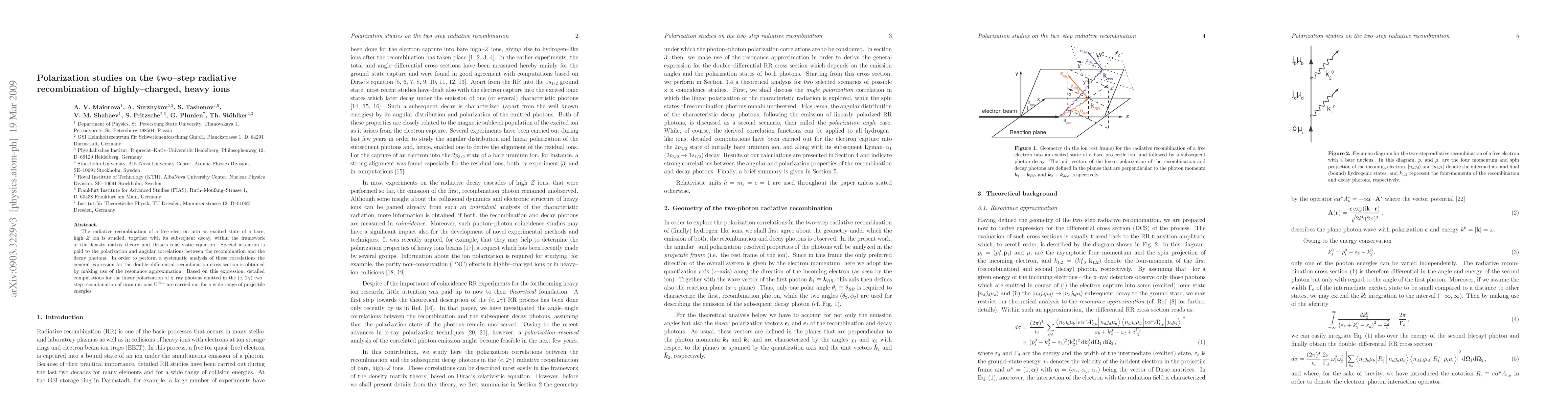 The radiative recombination of a free electron into an excited state of a bare, high-Z ion is studied, together with its subsequent decay, within the framework of the density matrix theory and Dirac's relativistic equation. Special attention is paid to the polarization and angular correlations between the recombination and the decay photons. In order to perform a systematic analysis of these correlations the general expression for the double-differential recombination cross section is obtained by making use of the resonance approximation. Based on this expression, detailed computations for the linear polarization of x-ray photons emitted in the (e, 2\gamma) two-step recombination of uranium ions U^92+ are carried out for a wide range of projectile energies.
