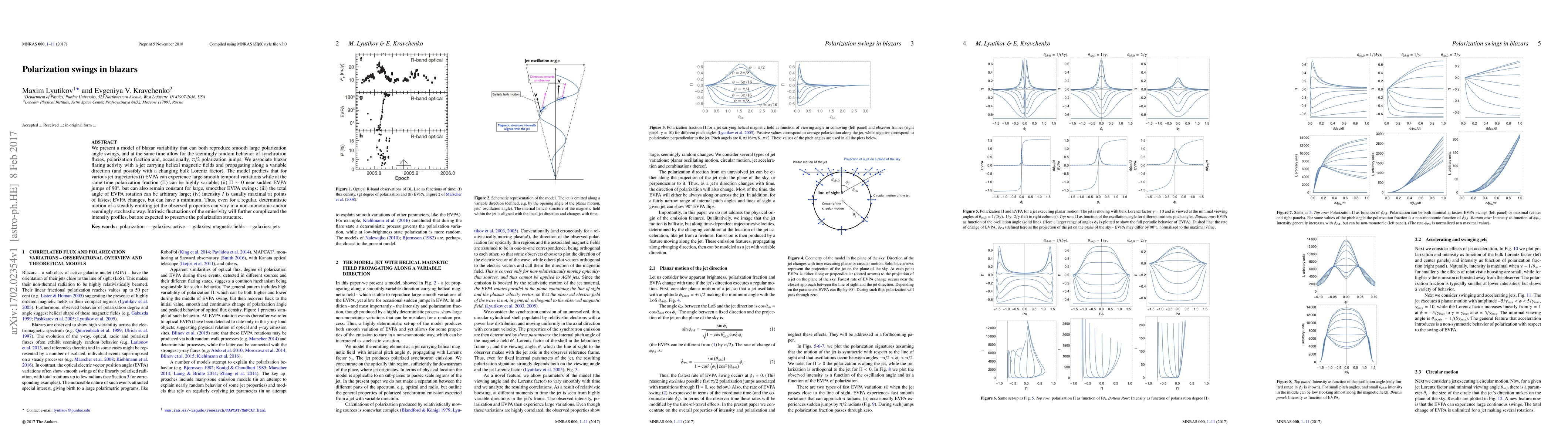The research presents a model of blazar variability that explains smooth polarization angle swings and seemingly random behavior of synchrotron fluxes, polarization fraction, and occasionally $\pi$/2 polarization jumps. The model associates blazar flaring activity with a jet carrying helical magnetic fields and propagating along a variable direction.