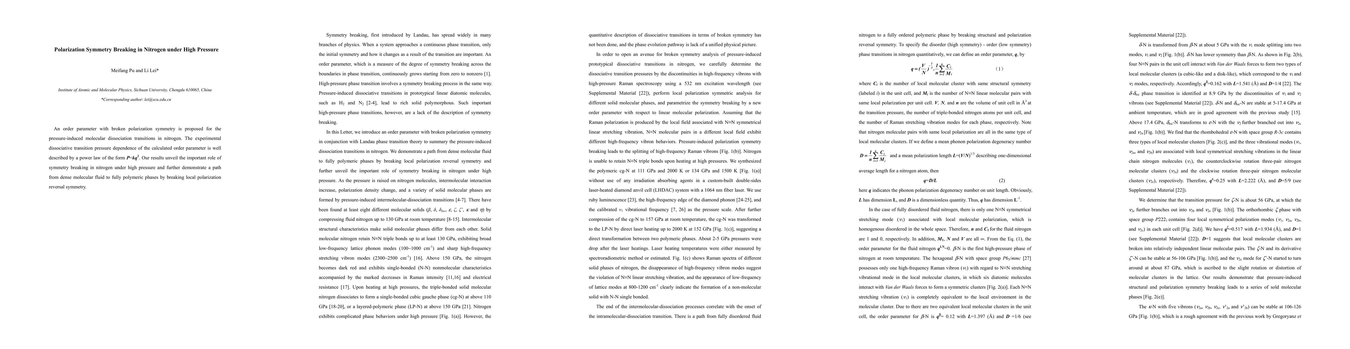 An order parameter with broken polarization symmetry is proposed for the pressure-induced molecular dissociation transitions in nitrogen. The experimental dissociative transition pressure dependence of the calculated order parameter is well described by a power law of the form P=kq2. Our results unveil the important role of symmetry breaking in nitrogen under high pressure and further demonstrate a path from dense molecular fluid to fully polymeric phases by breaking local polarization reversal symmetry.