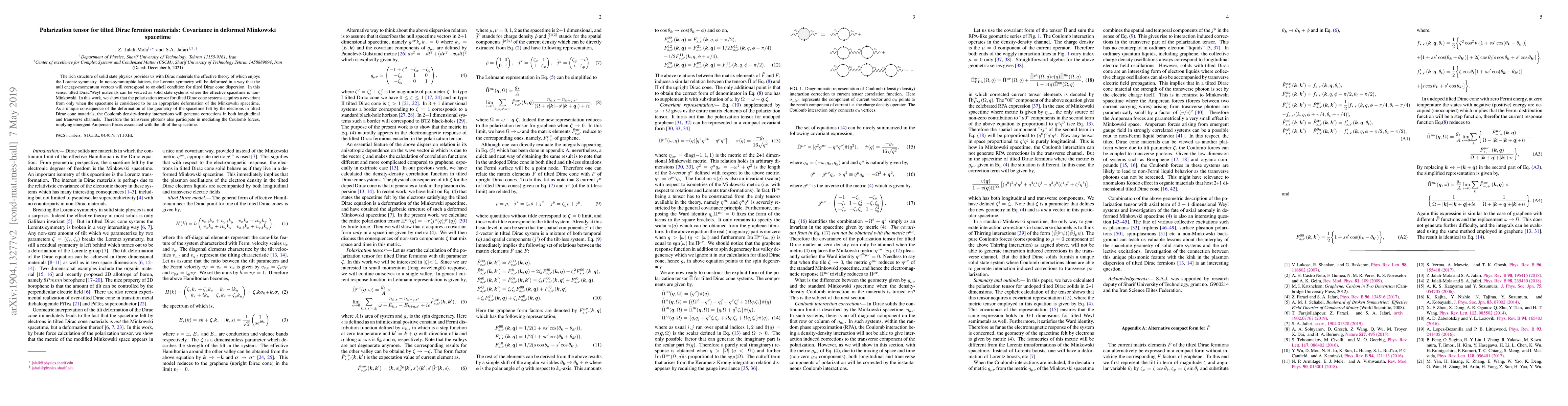 This paper examines the polarization tensor in tilted Dirac fermion materials within a deformed Minkowski spacetime, demonstrating its covariant form under appropriate spacetime deformation. It reveals that Coulomb interactions in these materials induce corrections in both longitudinal and transverse channels, leading to emergent Amperean forces due to the spacetime geometry's tilt.
