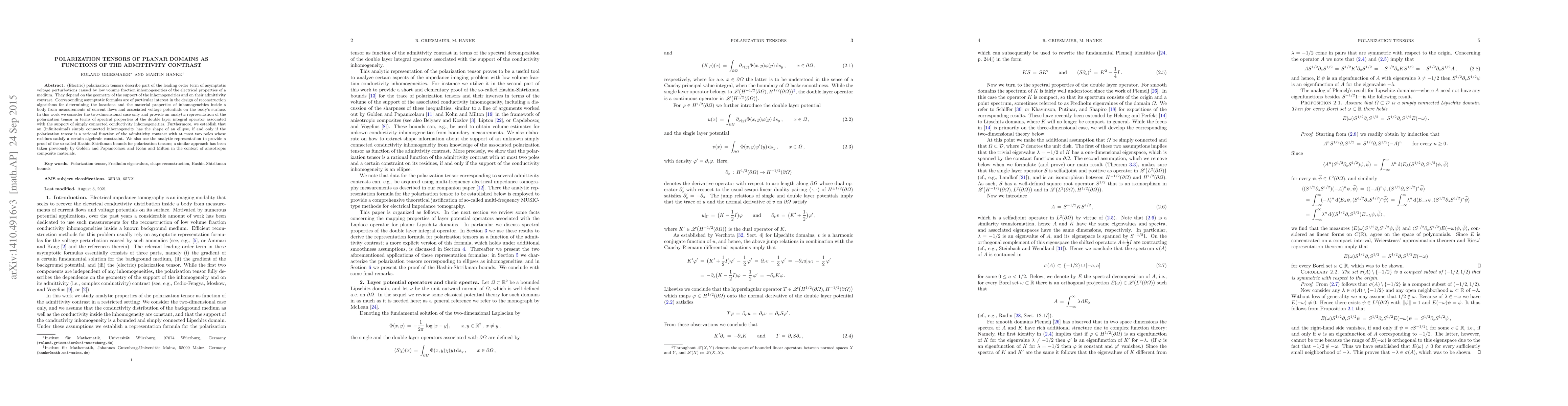 (Electric) polarization tensors describe part of the leading order term of asymptotic voltage perturbations caused by low volume fraction inhomogeneities of the electrical properties of a medium. They depend on the geometry of the support of the inhomogeneities and on their admittivity contrast. Corresponding asymptotic formulas are of particular interest in the design of reconstruction algorithms for determining the locations and the material properties of inhomogeneities inside a body from measurements of current flows and associated voltage potentials on the body's surface. In this work we consider the two-dimensional case only and provide an analytic representation of the polarization tensor in terms of spectral properties of the double layer integral operator associated with the support of simply connected conductivity inhomogeneities. Furthermore, we establish that an (infinitesimal) simply connected inhomogeneity has the shape of an ellipse, if and only if the polarization tensor is a rational function of the admittivity contrast with at most two poles whose residues satisfy a certain algebraic constraint. We also use the analytic representation to provide a proof of the so-called Hashin-Shtrikman bounds for polarization tensors; a similar approach has been taken previously by Golden and Papanicolaou and Kohn and Milton in the context of anisotropic composite materials.