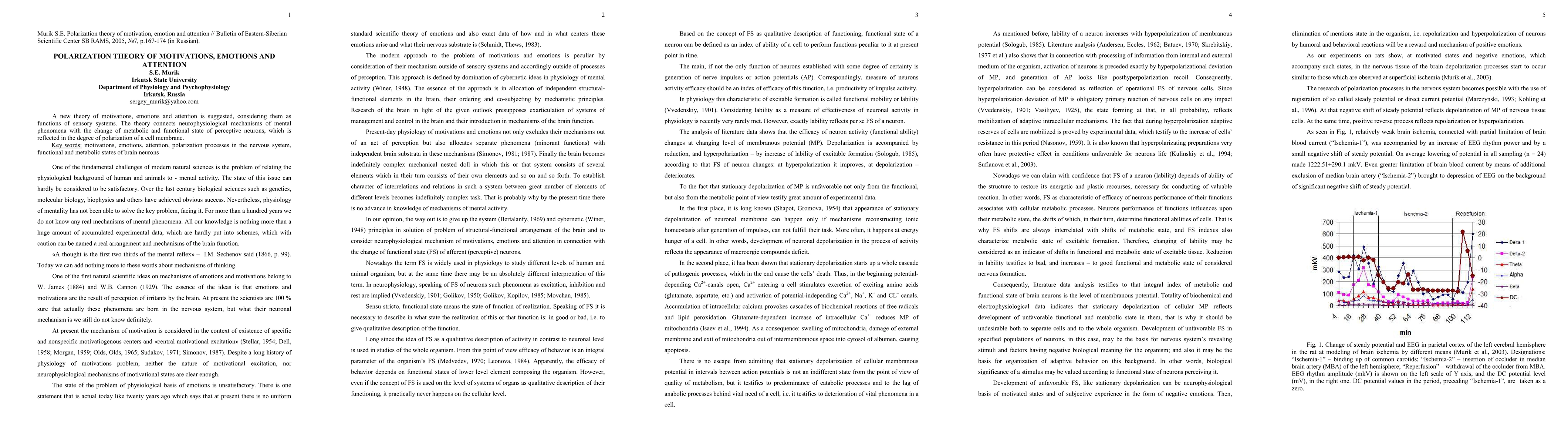 The Polarization Theory of Motivations, Emotions and Attention proposes that these mental phenomena are functions of sensory systems, with their neurophysiological mechanisms linked to the polarization state of perceptive neurons, reflecting changes in their metabolic and functional state.