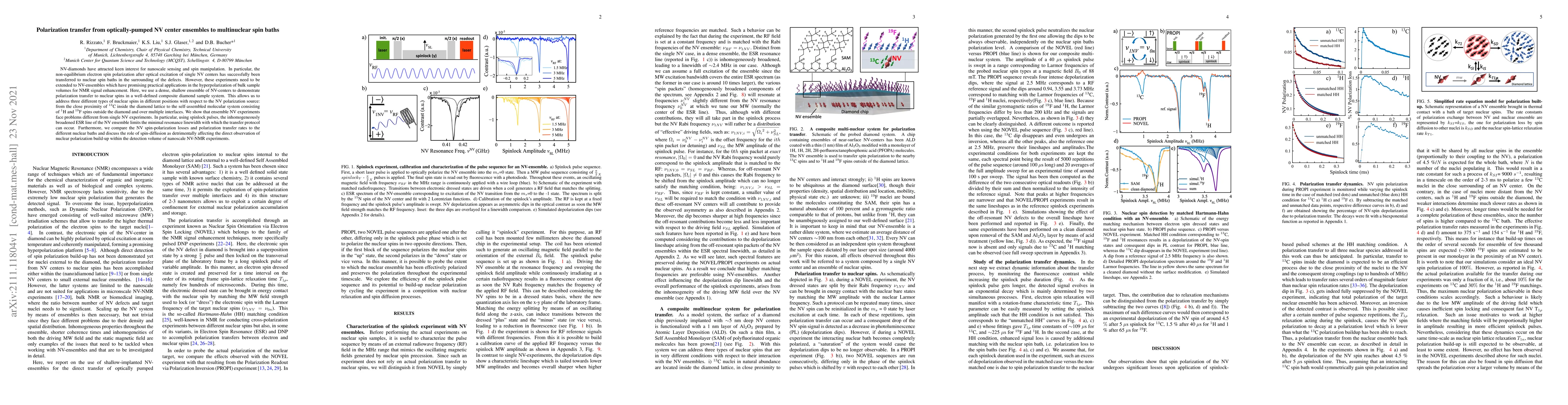 NV-diamonds have attracted keen interest for nanoscale sensing and spin manipulation. In particular, the non-equilibrium electron spin polarization after optical excitation of single NV centers has successfully been transferred to nuclear spin baths in the surrounding of the defects. However, these experiments need to be extended to NV-ensembles which have promising practical applications in the hyperpolarization of bulk sample volumes for NMR signal enhancement. Here, we use a dense, shallow ensemble of NV-centers to demonstrate polarization transfer to nuclear spins in a well-defined composite diamond sample system. This allows us to address three different types of nuclear spins in different positions with respect to the NV polarization source: from the close proximity of $^{13}$C inside the diamond lattice to the self-assembled molecular system consisting of $^{1}$H and $^{19}$F spins outside the diamond and over multiple interfaces. We show that ensemble NV experiments face problems different from single NV experiments. In particular, using spinlock pulses, the inhomogeneously broadened ESR line of the NV ensemble limits the minimal resonance linewidth with which the transfer protocol can occur. Furthermore, we compare the NV spin-polarization losses and polarization transfer rates to the different nuclear baths and discuss the role of spin-diffusion as detrimentally affecting the direct observation of nuclear polarization build-up within the detection volume of nanoscale NV-NMR experiments.