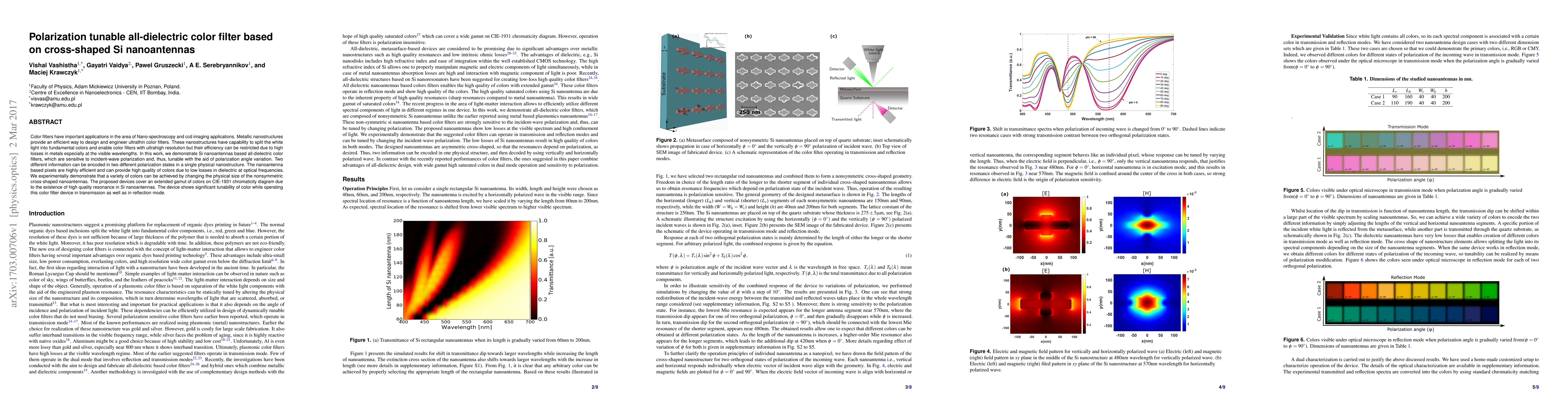 This research presents a polarization-tunable all-dielectric color filter using cross-shaped Si nanoantennas, achieving high-resolution colors with low losses due to dielectric properties. The filter's color tunability is demonstrated through variations in the polarization angle, enabling a wide range of colors via changes in nanoantenna size.