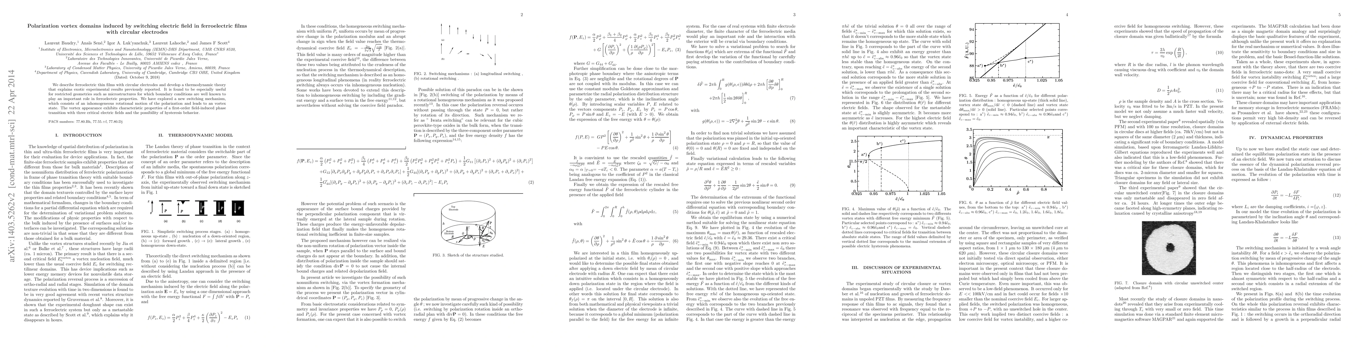 We describe ferroelectric thin films with circular electrodes and develop a thermodynamic theory that explains previously mysterious experiments. It is found to be especially useful for restricted geometries such as microstructures for which boundary conditions are well known to play an important role in ferroelectric properties. We have explored a new switching mechanism, which consists of an inhomogeneous rotational motion of the polarization and leads to an extended vortex state. The vortex appearance exhibits characteristic properties of a first-order field-induced phase transition: three critical electric fields and the possibility of hysteresis behavior.