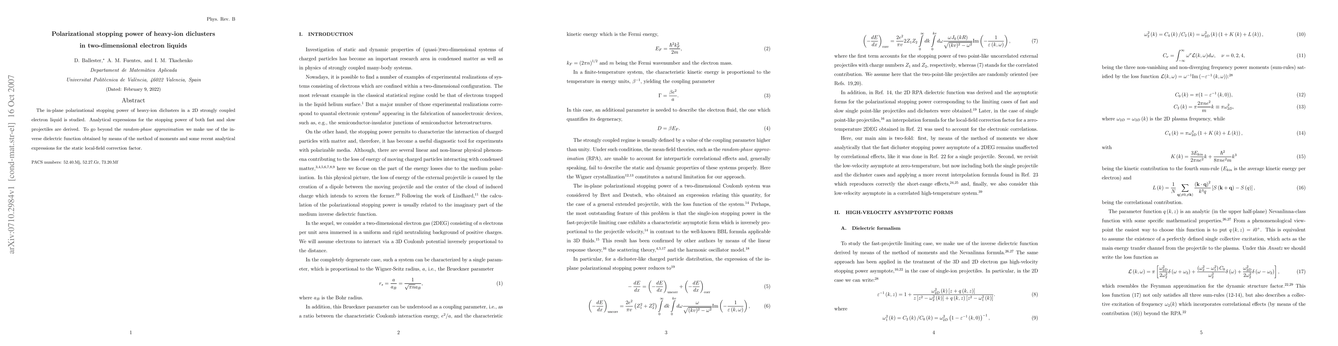 This paper derives analytical expressions for the in-plane polarizational stopping power of heavy-ion diclusters in a two-dimensional strongly coupled electron liquid, moving beyond the random-phase approximation with the use of an inverse dielectric function and static local-field correction factors.
