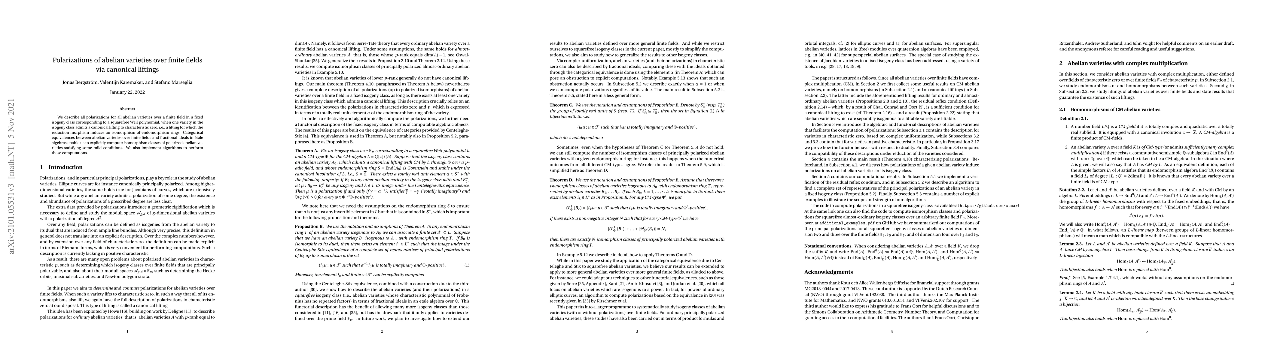 This paper characterizes all polarizations of abelian varieties over finite fields within a fixed isogeny class, given that one variety has a canonical lifting to characteristic zero. It leverages categorical equivalences and fractional ideals to compute these polarizations and provides algorithms for the computations.