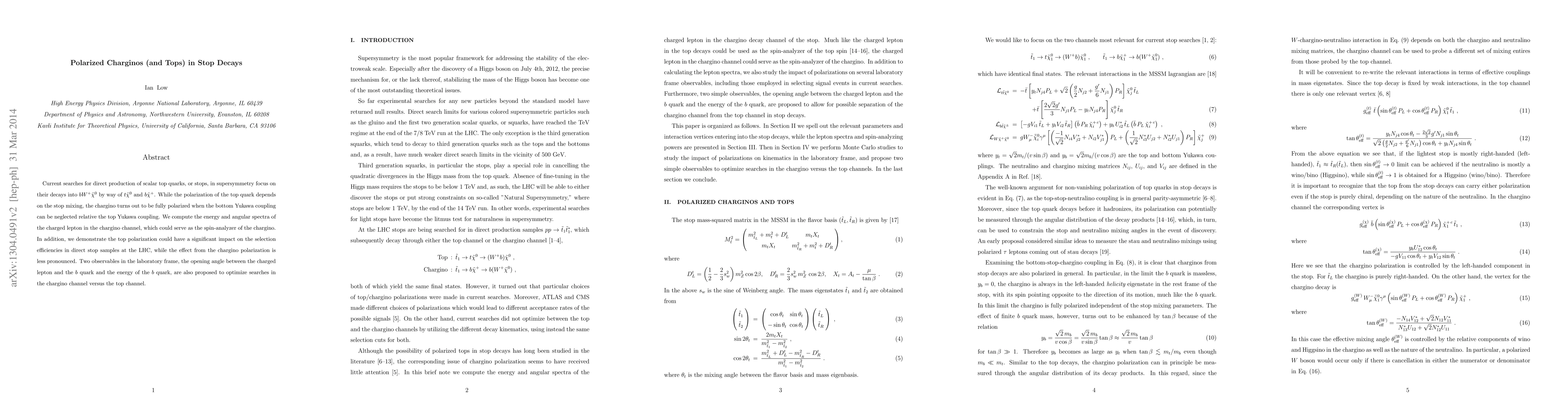 Current searches for direct production of scalar top quarks, or stops, in supersymmetry focus on their decays into W boson + b quark + neutralino by way of top + neutralino and bottom + chargino. While the polarization of the top quark depends on the stop mixing, the chargino turns out to be fully polarized when the bottom Yukawa coupling can be neglected relative the top Yukawa coupling. We compute the energy and angular spectra of the charged lepton in the chargino channel, which could serve as the spin-analyzer of the chargino. In addition, we demonstrate the top polarization could have a significant impact on the selection efficiencies in direct stop samples at the LHC, while the effect from the chargino polarization is less pronounced. Two observables in the laboratory frame, the opening angle between the charged lepton and the b quark and the energy of the b quark, are also proposed to optimize searches in the chargino channel versus the top channel.