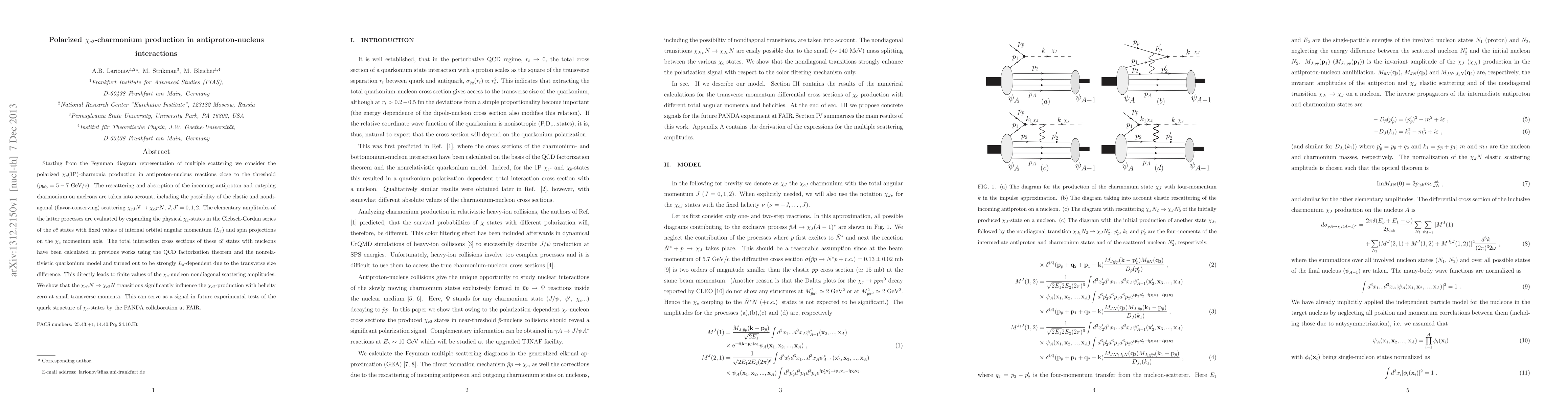 Starting from the Feynman diagram representation of multiple scattering we consider the polarized $\chi_c$(1P)-charmonia production in antiproton-nucleus reactions close to the threshold ($p_{\rm lab}=5-7$ GeV/c). The rescattering and absorption of the incoming antiproton and outgoing charmonium on nucleons are taken into account, including the possibility of the elastic and nondiagonal (flavor-conserving) scattering $\chi_{cJ} N \to \chi_{cJ^\prime} N$, $J,J^\prime=0,1,2$. The elementary amplitudes of the latter processes are evaluated by expanding the physical $\chi_c$-states in the Clebsch-Gordan series of the $c \bar c$ states with fixed values of internal orbital angular momentum ($L_z$) and spin projections on the $\chi_c$ momentum axis. The total interaction cross sections of these $c \bar c$ states with nucleons have been calculated in previous works using the QCD factorization theorem and the nonrelativistic quarkonium model and turned out to be strongly $L_z$-dependent due to the transverse size difference. This directly leads to finite values of the $\chi_c$-nucleon nondiagonal scattering amplitudes. We show that the $\chi_{c0} N \to \chi_{c2} N$ transitions significantly influence the $\chi_{c2}$-production with helicity zero at small transverse momenta. This can serve as a signal in future experimental tests of the quark structure of $\chi_c$-states by the PANDA collaboration at FAIR.