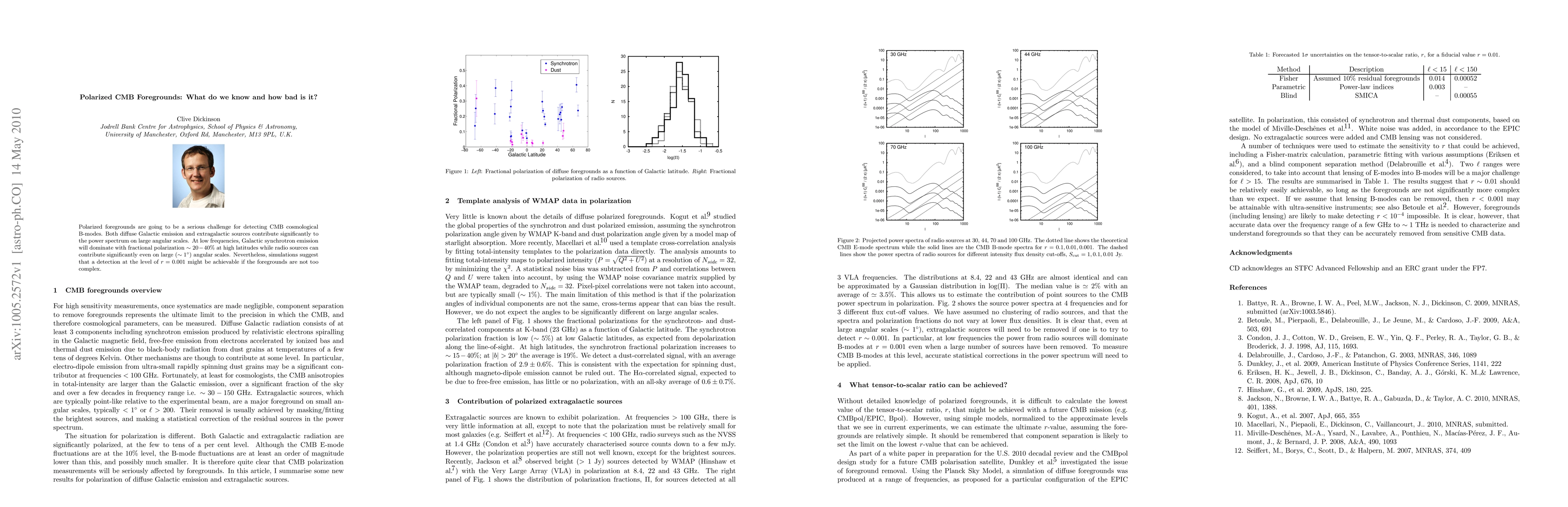 Polarized foregrounds are going to be a serious challenge for detecting CMB cosmological B-modes. Both diffuse Galactic emission and extragalactic sources contribute significantly to the power spectrum on large angular scales. At low frequencies, Galactic synchrotron emission will dominate with fractional polarization $\sim 20-40%$ at high latitudes while radio sources can contribute significantly even on large ($\sim 1^{\circ}$) angular scales. Nevertheless, simulations suggest that a detection at the level of $r=0.001$ might be achievable if the foregrounds are not too complex.
