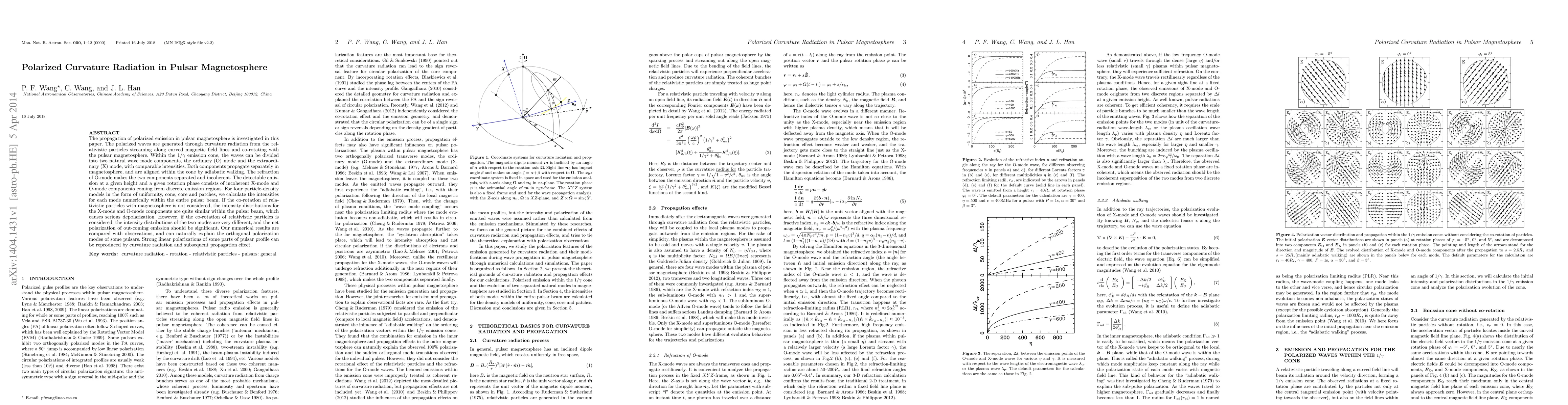 This paper investigates the polarized emission in pulsar magnetospheres, showing that curvature radiation from relativistic particles generates two distinct wave modes, the ordinary (O) and extraordinary (X) modes. When relativistic particles co-rotate with the magnetosphere, the modes exhibit significant net polarization, explaining the observed orthogonal polarization in some pulsars.