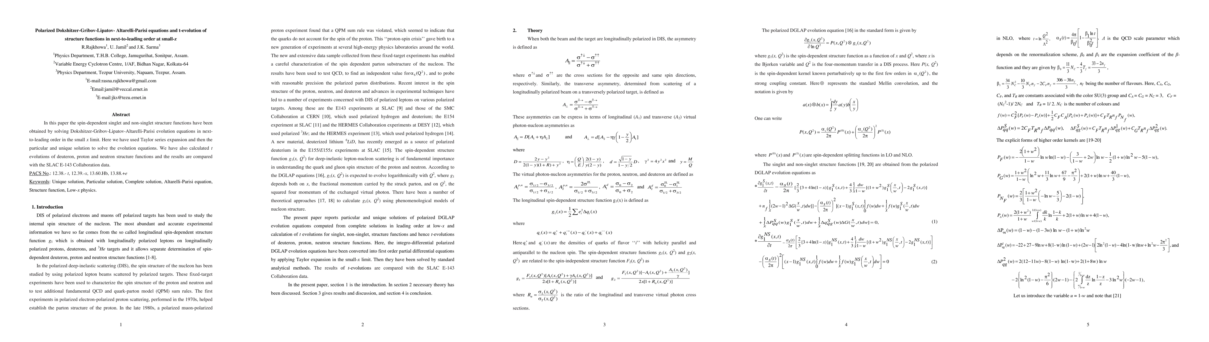 This paper solves the polarized Dokshitzer-Gribov-Lipatov-Altarelli-Parisi evolution equations in next-to-leading order to derive spin-dependent singlet and non-singlet structure functions at small x, using Taylor series expansion, and compares the calculated t-evolutions of deuteron, proton, and neutron structure functions with experimental data from the SLAC E-143 Collaboration.