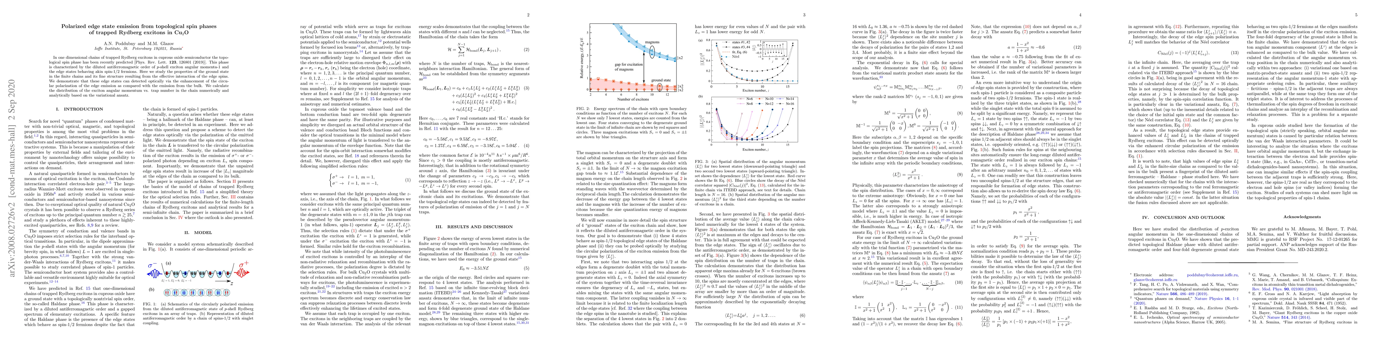 In one dimensional chains of trapped Rydberg excitons in cuprous oxide semiconductor the topological spin phase has been recently predicted [Phys. Rev. Lett. 123, 126801 (2019); arXiv:1903.11951]. This phase is characterized by the diluted antiferromagnetic order of $p$-shell exciton angular momenta-$1$ and the edge states behaving akin spin-$1/2$ fermions. Here we study the properties of the ground state in the finite chains and its fine structure resulting from the effective interaction of the edge spins. We demonstrate that these edge states can detected optically via the enhancement of the circular polarization of the edge emission as compared with the emission from the bulk. We calculate the distribution of the exciton angular momentum vs. trap number in the chain numerically and analytically based on the variational ansatz.