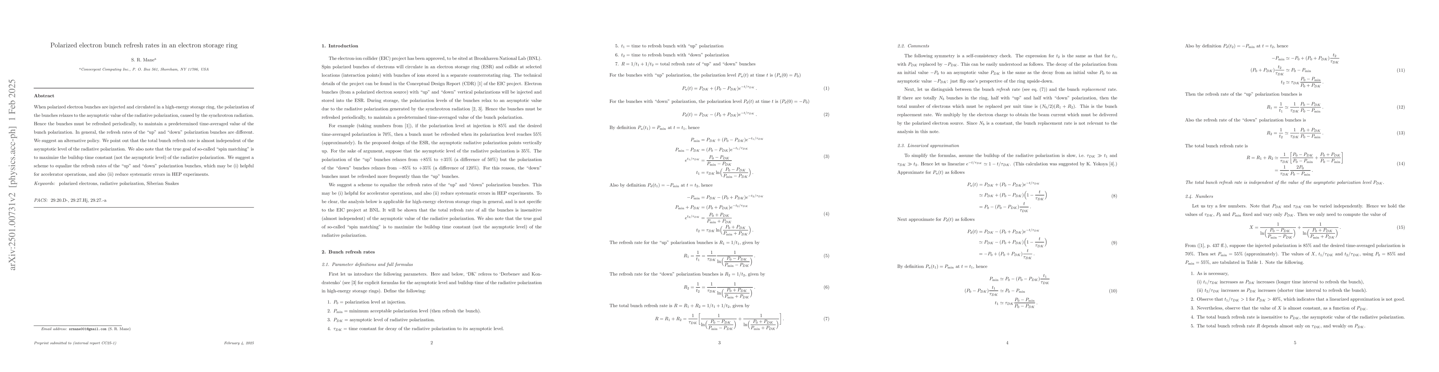 Summary: This paper discusses methods to refresh polarized electron bunches in a storage ring, noting that polarization relaxation due to synchrotron radiation necessitates periodic bunch refreshment. It proposes a scheme to equalize the refresh rates for "up" and "down" polarizations, which could improve accelerator operations and reduce systematic errors in high-energy physics experiments.