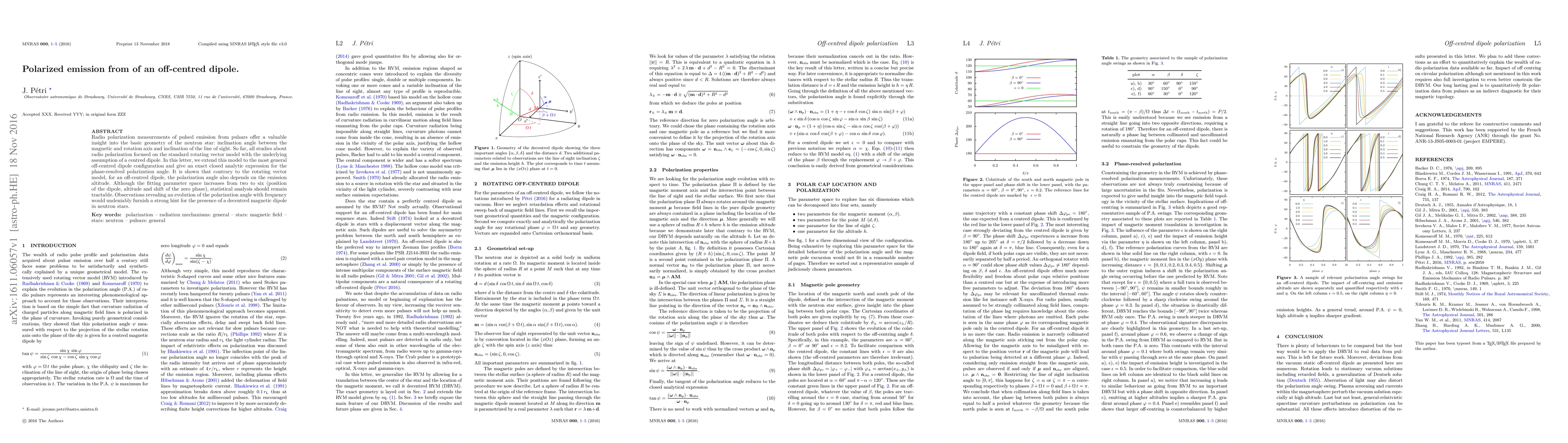 Radio polarization measurements of pulsed emission from pulsars offer a valuable insight into the basic geometry of the neutron star: inclination angle between the magnetic and rotation axis and inclination of the line of sight. So far, all studies about radio polarization focused on the standard rotating vector model with the underlying assumption of a centred dipole. In this letter, we extend this model to the most general off-centred dipole configuration and give an exact closed analytic expression for the phase-resolved polarization angle. It is shown that contrary to the rotating vector model, for an off-centred dipole, the polarization angle also depends on the emission altitude. Although the fitting parameter space increases from two to six (position of the dipole, altitude and shift of the zero phase), statistical analysis should remain tractable. Observations revealing an evolution of the polarization angle with frequency would undeniably furnish a strong hint for the presence of a decentred magnetic dipole in neutron stars.