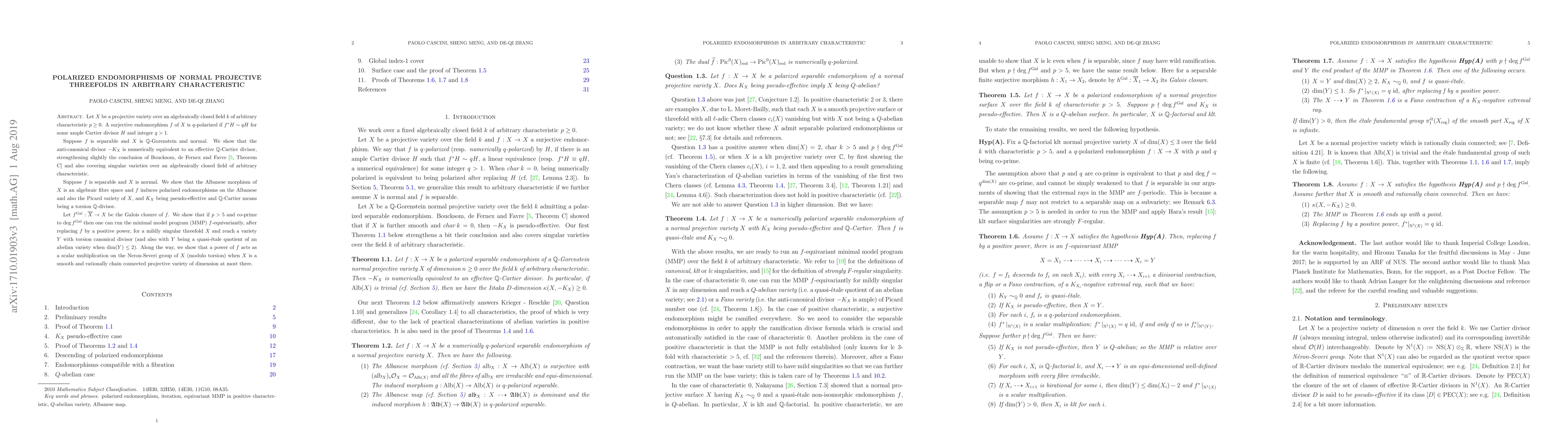 Let $X$ be a projective variety over an algebraically closed field $k$ of arbitrary characteristic $p \ge 0$. A surjective endomorphism $f$ of $X$ is $q$-polarized if $f^\ast H \sim qH$ for some ample Cartier divisor $H$ and integer $q > 1$. Suppose $f$ is separable and $X$ is $\mathbb{Q}$-Gorenstein and normal. We show that the anti-canonical divisor $-K_X$ is numerically equivalent to an effective $\mathbb{Q}$-Cartier divisor, strengthening slightly the conclusion of Boucksom, de Fernex and Favre (Theorem C) and also covering singular varieties over an algebraically closed field of arbitrary characteristic. Suppose $f$ is separable and $X$ is normal. We show that the Albanese morphism of $X$ is an algebraic fibre space and $f$ induces polarized endomorphisms on the Albanese and also the Picard variety of $X$, and $K_X$ being pseudo-effective and $\mathbb{Q}$-Cartier means being a torsion $\mathbb{Q}$-divisor. Let $f^{Gal}:\overline{X}\to X$ be the Galois closure of $f$. We show that if $p>5$ and co-prime to $deg\, f^{Gal}$ then one can run the minimal model program (MMP) $f$-equivariantly, after replacing $f$ by a positive power, for a mildly singular threefold $X$ and reach a variety $Y$ with torsion canonical divisor (and also with $Y$ being a quasi-\'etale quotient of an abelian variety when $\dim(Y)\le 2$). Along the way, we show that a power of $f$ acts as a scalar multiplication on the Neron-Severi group of $X$ (modulo torsion) when $X$ is a smooth and rationally chain connected projective variety of dimension at most three.