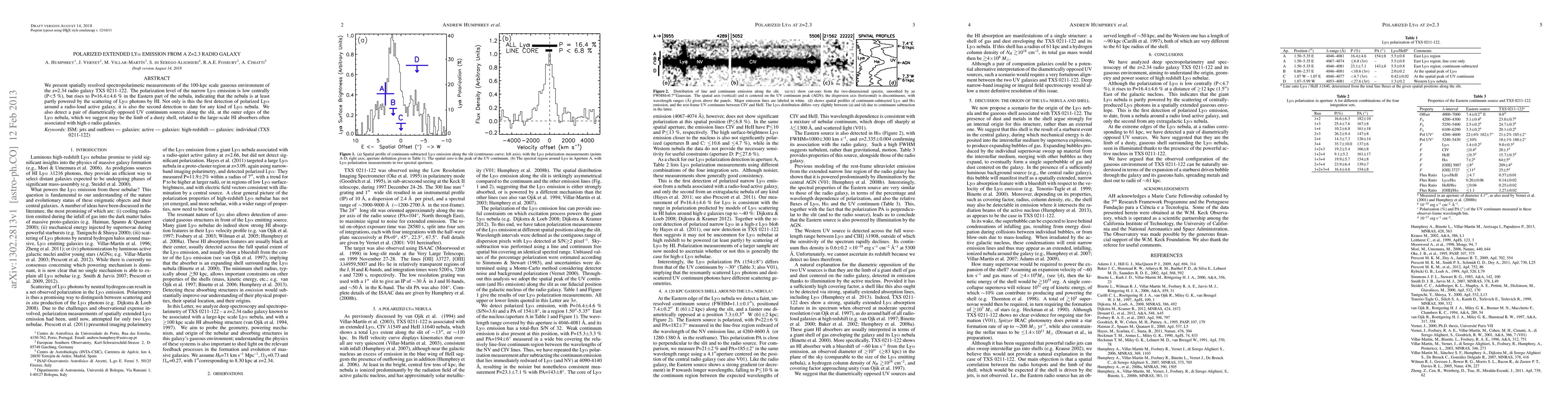 We present spatially resolved spectropolarimetic measurements of the 100-kpc scale gaseous environment of the z=2.34 radio galaxy TXS 0211-122. The polarization level of the narrow Ly-alpha emission is low centrally (P<5 %), but rises to P=16.4+/-4.6 % in the Eastern part of the nebula, indicating that the nebula is at least partly powered by the scattering of Ly-alpha photons by HI. Not only is this the first detection of polarized Ly-alpha around a radio-loud active galaxy, it is also the second detection to date for any kind of Ly-alpha nebula. We also detect a pair of diametrically opposed UV continuum sources along the slit, at the outer edges of the Ly-alpha nebula, which we suggest may be the limb of a dusty shell, related to the large-scale HI absorbers often associated with high-z radio galaxies.
