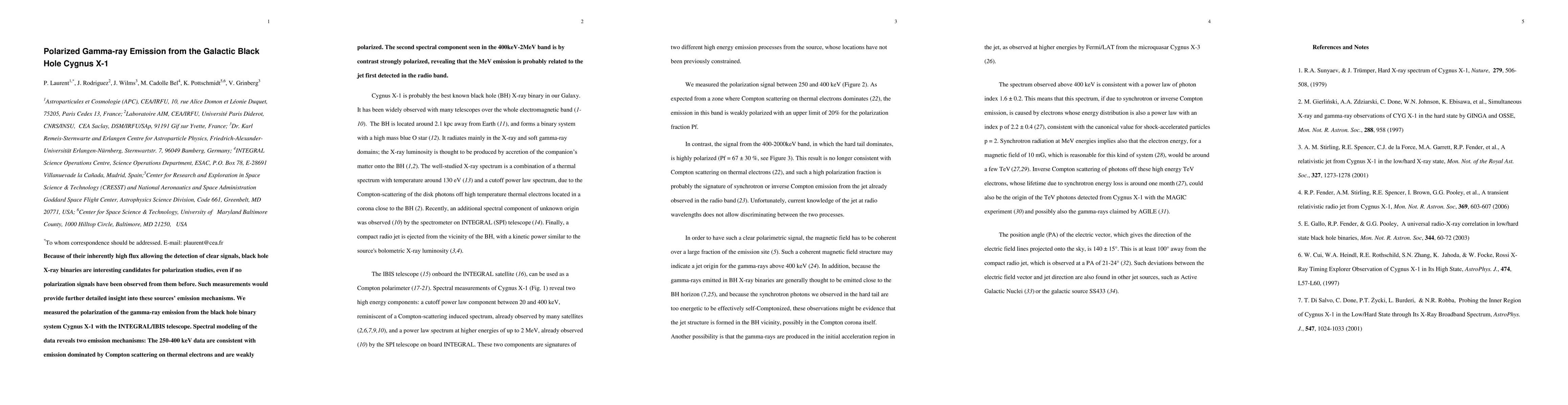 This study uses the INTEGRAL/IBIS telescope to measure the polarization of gamma-ray emission from Cygnus X-1, revealing two distinct emission mechanisms: weakly polarized Compton scattering at 250-400 keV and strongly polarized emission at 400 keV-2 MeV, likely associated with the jet.