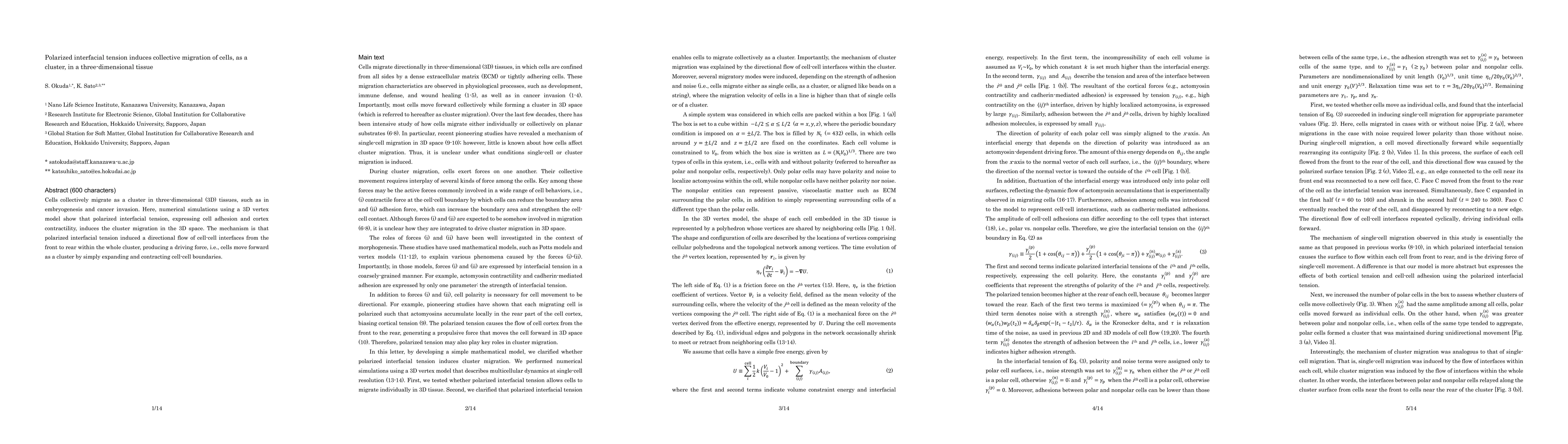 This paper demonstrates that polarized interfacial tension, driven by cell adhesion and cortex contractility, induces collective migration of cells as a cluster in three-dimensional tissues. Numerical simulations using a 3D vertex model reveal that this tension generates a directional flow of cell-cell interfaces, enabling the cluster to move forward by expanding and contracting cell-cell boundaries.