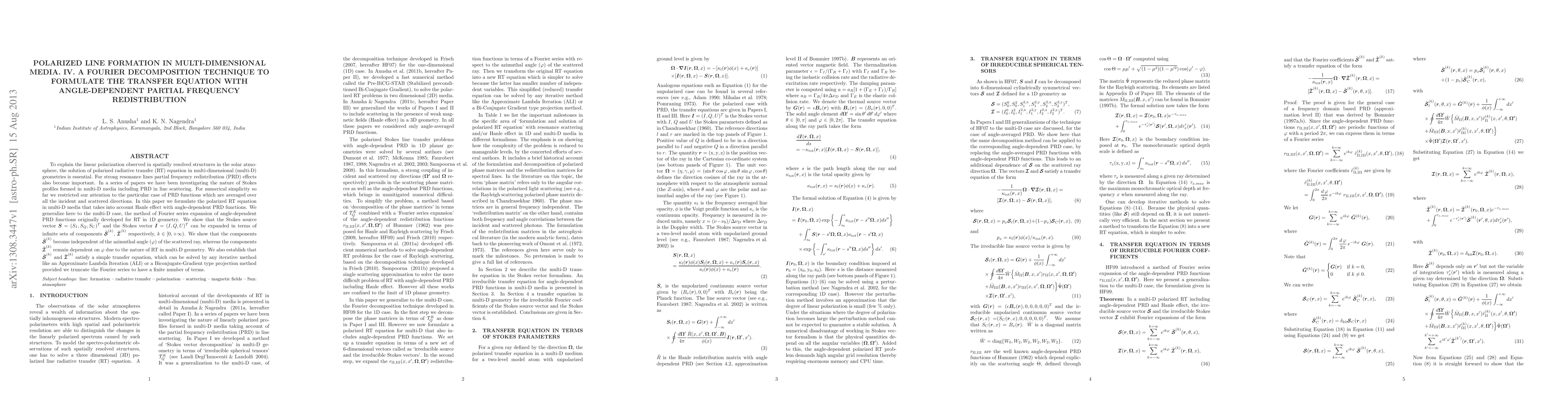 This paper develops a Fourier decomposition technique to formulate the polarized radiative transfer equation in multi-dimensional geometries, incorporating angle-dependent partial frequency redistribution. It shows that the Stokes source vector and the Stokes vector can be expanded into independent and dependent components, respectively, facilitating the solution of the transfer equation using iterative methods.