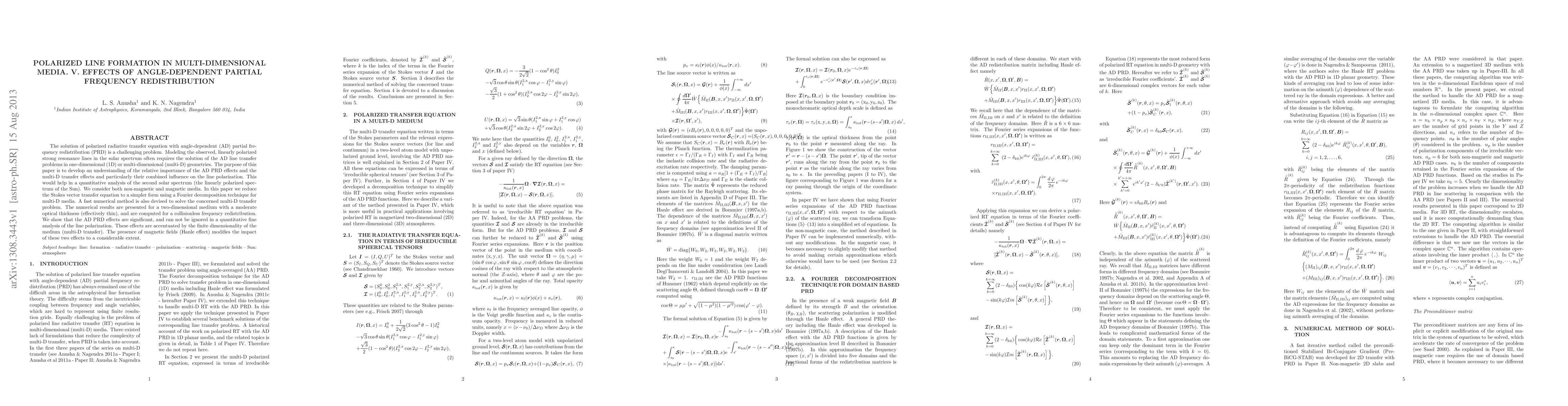 This paper investigates the effects of angle-dependent partial frequency redistribution (AD PRD) on polarized line formation in multi-dimensional media, employing Fourier decomposition and a fast numerical method. It finds that AD PRD effects significantly influence line polarization, especially in multi-dimensional geometries, and their impact is further modified by the presence of magnetic fields.