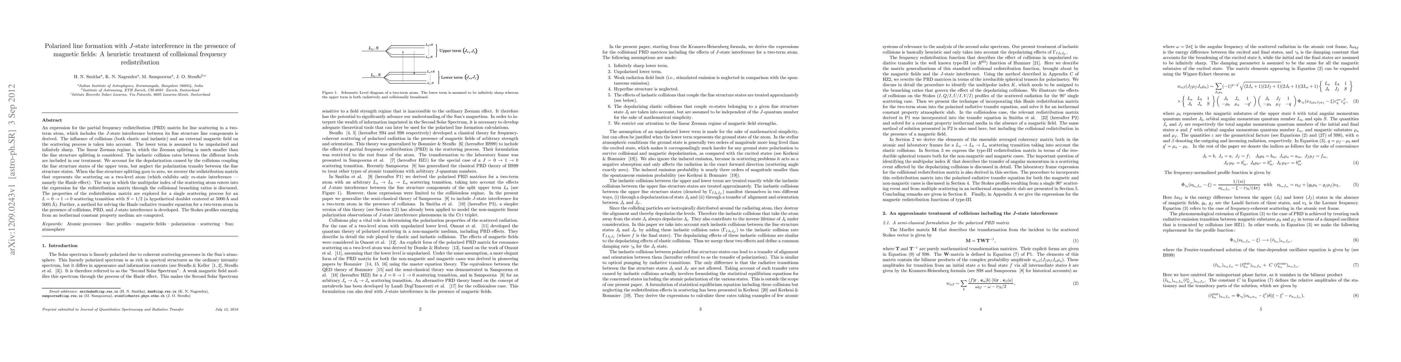 This paper derives a partial frequency redistribution matrix for line scattering in a two-term atom, considering J-state interference, collisions, and magnetic fields. It develops a method to solve the Hanle radiative transfer equation in this context, computing Stokes profiles for a hypothetical doublet transition.