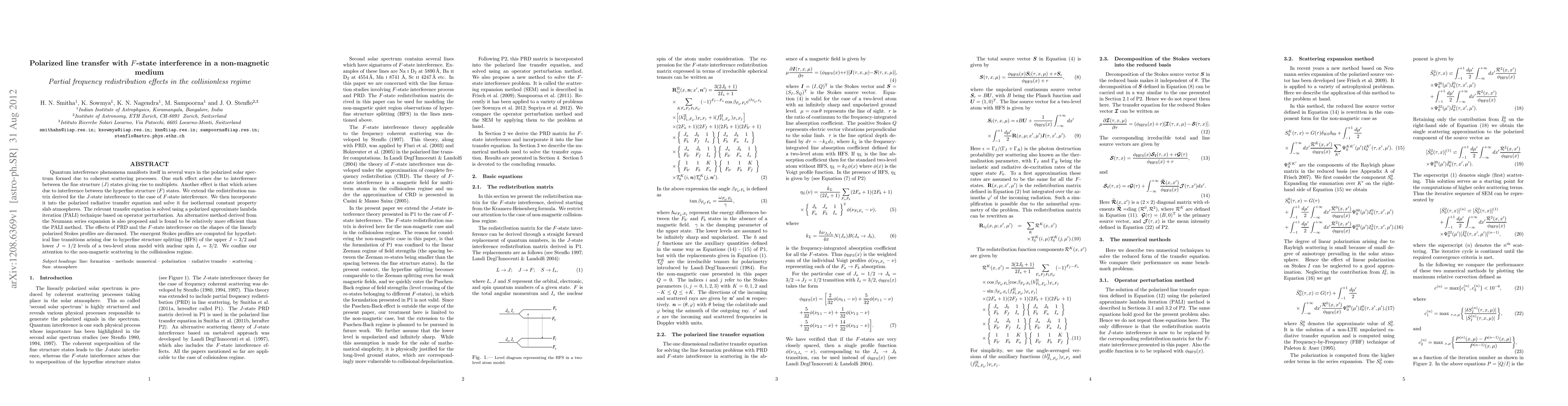 This paper investigates quantum interference effects in polarized solar spectra due to fine and hyperfine structure states, extending redistribution matrix theory to F-state interference. It solves the polarized radiative transfer equation using PALI and Neumann series methods, analyzing the impact on linearly polarized Stokes profiles in non-magnetic, collisionless media.
