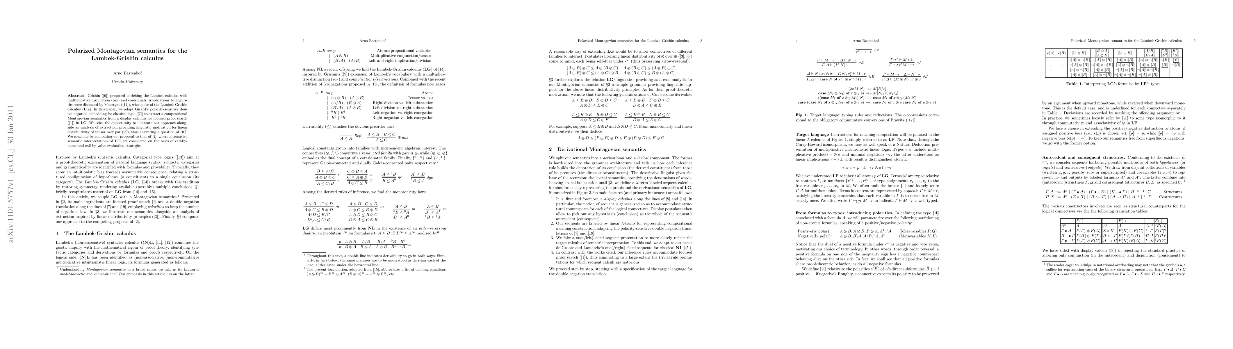 Grishin proposed enriching the Lambek calculus with multiplicative disjunction (par) and coresiduals. Applications to linguistics were discussed by Moortgat, who spoke of the Lambek-Grishin calculus (LG). In this paper, we adapt Girard's polarity-sensitive double negation embedding for classical logic to extract a compositional Montagovian semantics from a display calculus for focused proof search in LG. We seize the opportunity to illustrate our approach alongside an analysis of extraction, providing linguistic motivation for linear distributivity of tensor over par, thus answering a question of Kurtonina&Moortgat. We conclude by comparing our proposal to the continuation semantics of Bernardi&Moortgat, corresponding to call-by- name and call-by-value evaluation strategies.