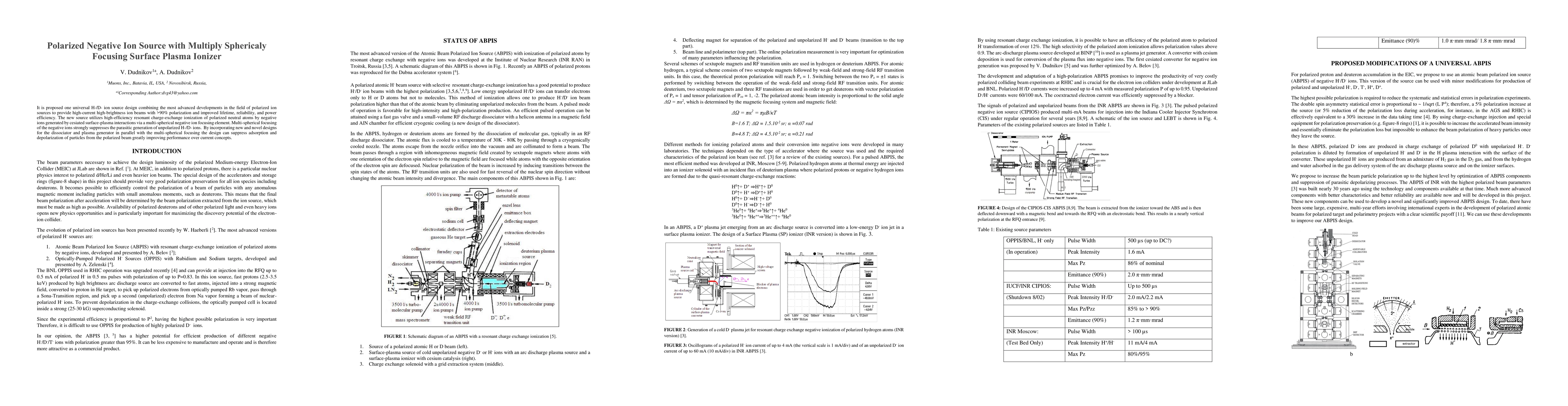 It is proposed one universal H-/D- ion source design combining the most advanced developments in the field of polarized ion sources to provide high-current high-brightness ion beams with >90% polarization and improved lifetime, reliability, and power efficiency. The new source utilizes high-efficiency resonant charge-exchange ionization of polarized neutral atoms by negative ions generated by cesiated surface-plasma interactions via a multi-spherical negative ion focusing element. Multi-spherical focusing of the negative ions strongly suppresses the parasitic generation of unpolarized H-/D- ions. By incorporating new and novel designs for the dissociator and plasma generator in parallel with the multi-spherical focusing the design can suppress adsorption and depolarization of particles from the polarized beam greatly improving performance over current concepts.