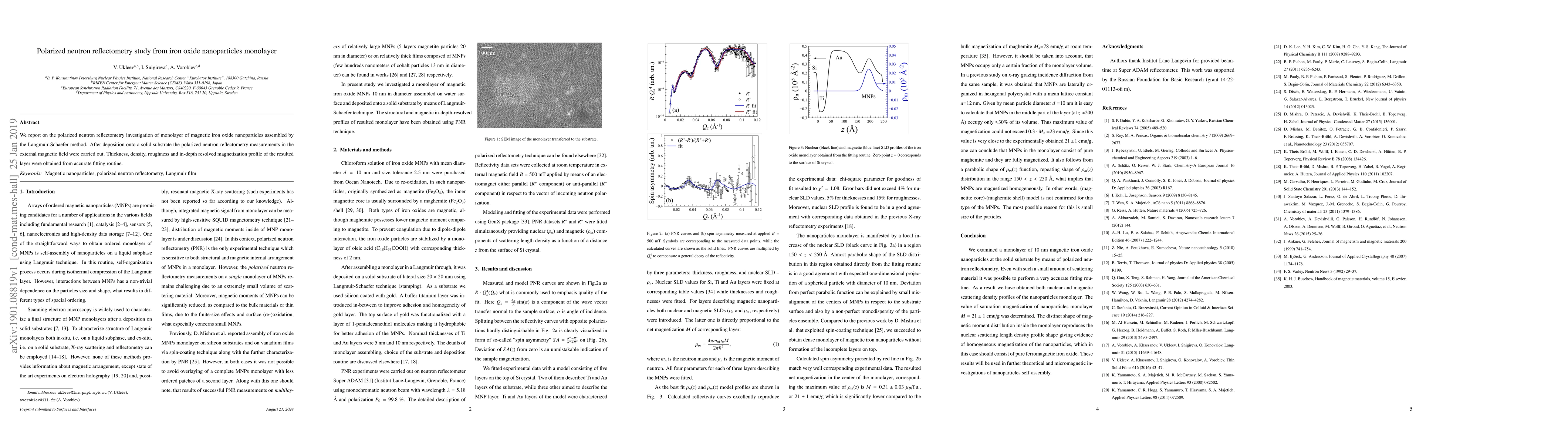 This study uses polarized neutron reflectometry to analyze a monolayer of magnetic iron oxide nanoparticles assembled via the Langmuir-Schaefer method. The investigation reveals thickness, density, roughness, and an in-depth magnetization profile of the layer under an external magnetic field.