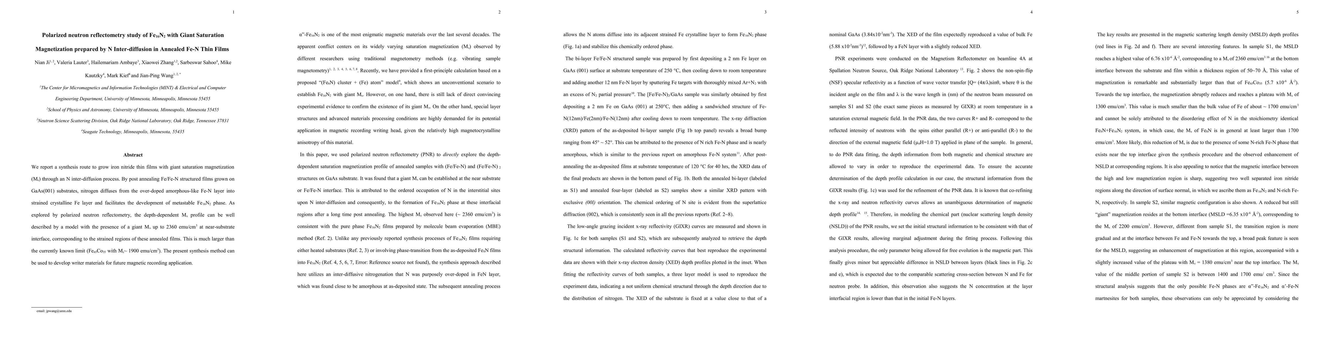 This study details a method to synthesize iron nitride thin films via nitrogen inter-diffusion, resulting in Fe16N2 with a giant saturation magnetization of up to 2360 emu/cm³. Polarized neutron reflectometry reveals a depth-dependent magnetic profile, showing potential for advanced magnetic recording materials.
