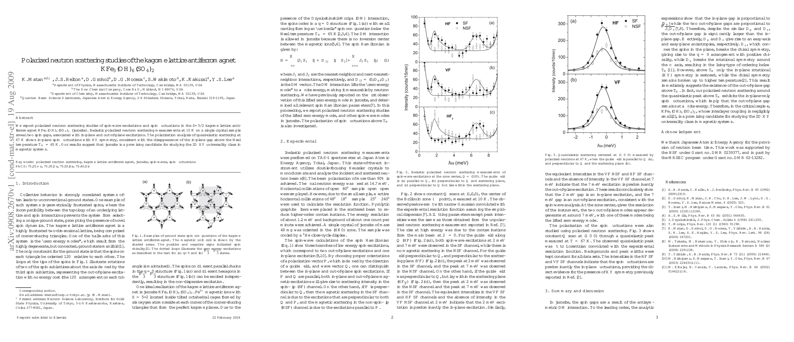 Researchers studied jarosite, a 2D antiferromagnet, using polarized neutron scattering, finding two spin gaps at low temperatures that disappear above the Neel temperature, suggesting it's a promising candidate for studying magnetic systems.