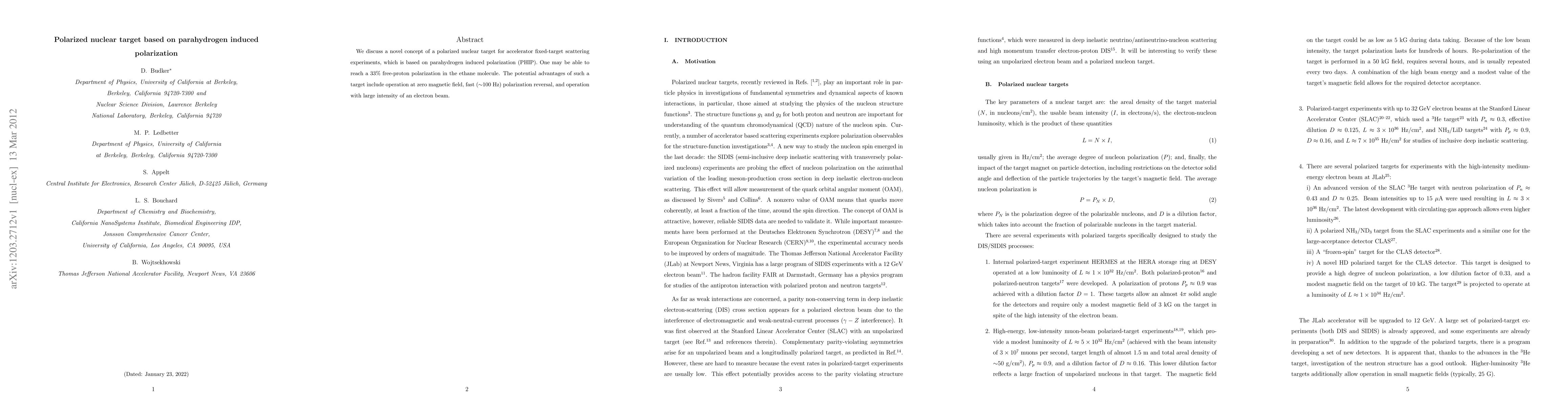 This paper introduces a novel polarized nuclear target for accelerator experiments, utilizing parahydrogen induced polarization (PHIP) to achieve up to 33% proton polarization in ethane. The target offers benefits such as zero magnetic field operation, rapid polarization reversal, and compatibility with high-intensity electron beams.