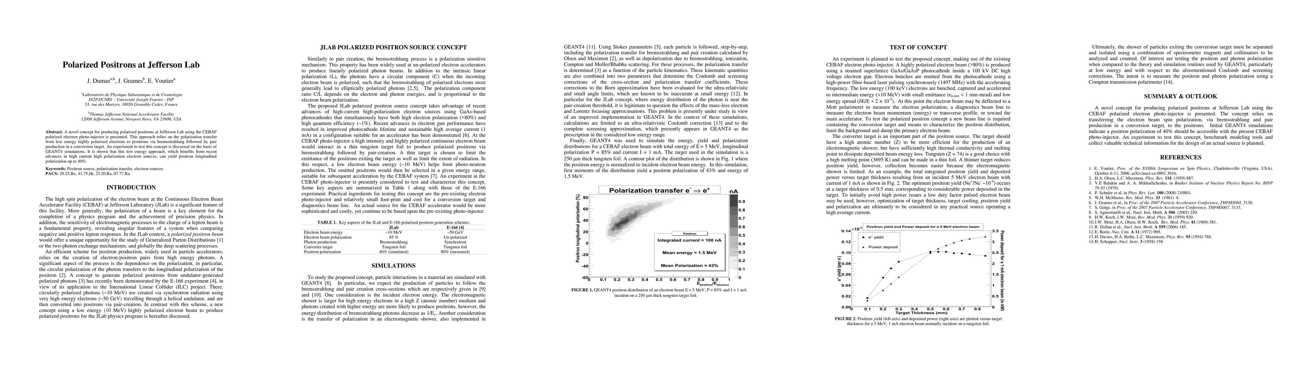 A novel concept for producing polarized positrons at Jefferson Lab using the CEBAF polarized electron photo-injector is presented. This approach relies on the polarization transfer from low energy highly polarized electrons to positrons via bremsstrahlung followed by pair production in a conversion target. An experiment to test this concept is discussed on the basis of GEANT4 simulations. It is shown that this low energy approach, which benefits from recent advances in high current high polarization electron sources, can yield positron longitudinal polarization up to 40%.