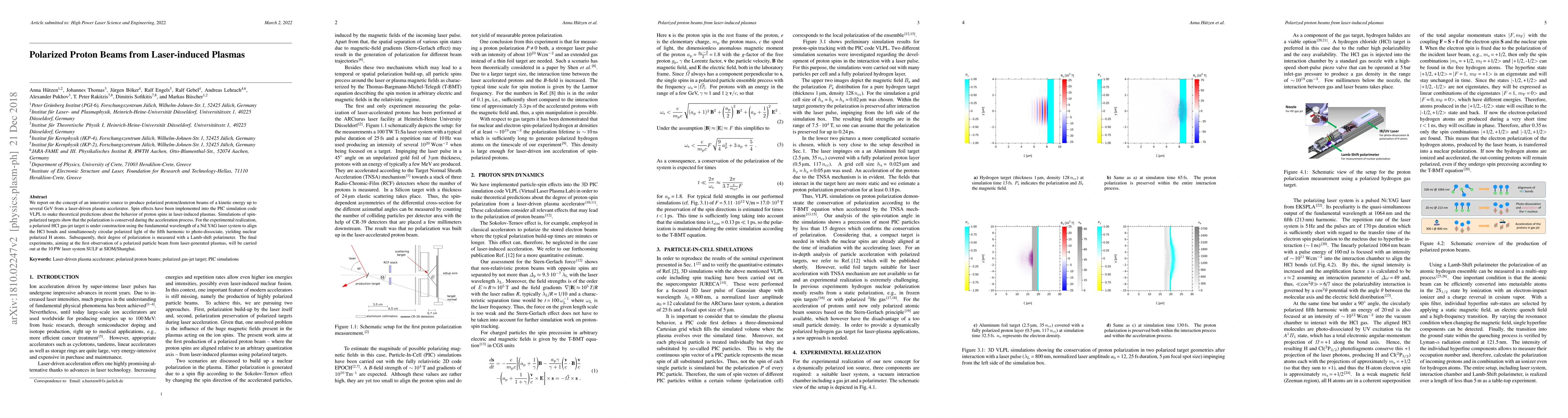 We report on the concept of an innovative source to produce polarized proton/deuteron beams of a kinetic energy up to several GeV from a laser-driven plasma accelerator. Spin effects have been implemented into the PIC simulation code VLPL to make theoretical predictions about the behavior of proton spins in laser-induced plasmas. Simulations of spin-polarized targets show that the polarization is conserved during the acceleration process. For the experimental realization, a polarized HCl gas-jet target is under construction using the fundamental wavelength of a Nd:YAG laser system to align the HCl bonds and simultaneously circular polarized light of the fifth harmonic to photo-dissociate, yielding nuclear polarized H atoms. Subsequently, their degree of polarization is measured with a Lamb-shift polarimeter. The final experiments, aiming at the first observation of a polarized particle beam from laser-generated plasmas, will be carried out at the 10 PW laser system SULF at SIOM/Shanghai.