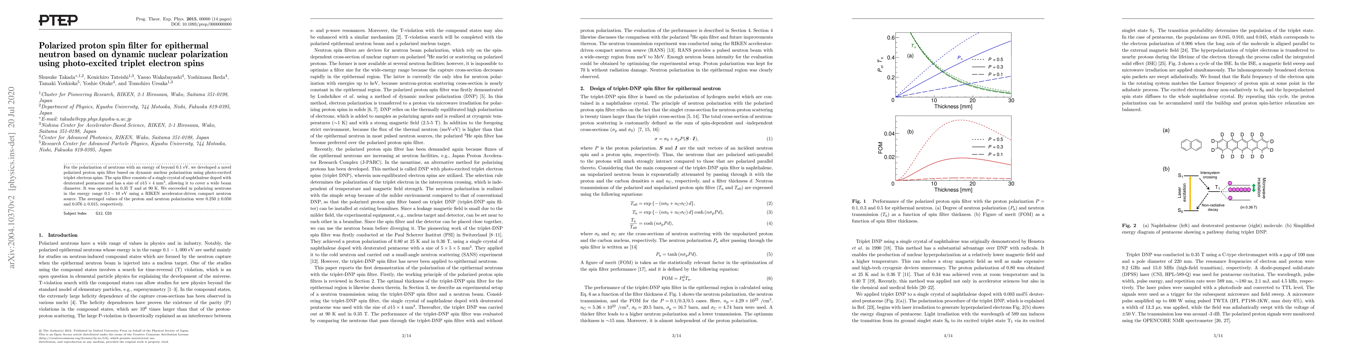 This paper presents a novel polarized proton spin filter for epithermal neutrons based on dynamic nuclear polarization using photo-excited triplet electron spins. The filter, made from a naphthalene crystal doped with deuterated pentacene, achieved neutron polarization in the energy range of 0.1-10 eV using a compact neutron source.