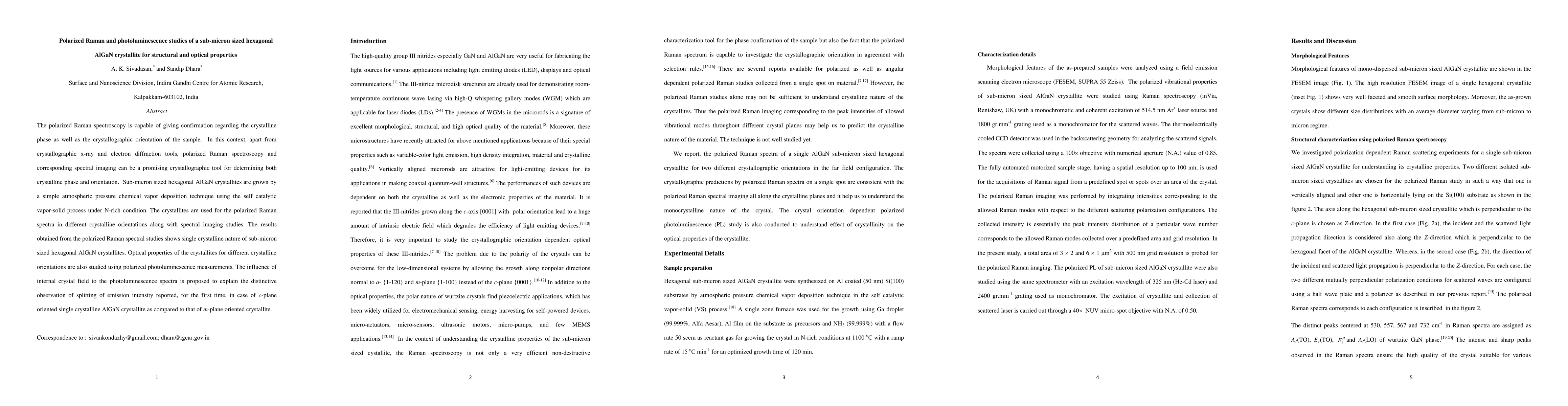 This study employs polarized Raman spectroscopy and photoluminescence measurements to investigate the structural and optical properties of sub-micron sized hexagonal AlGaN crystallites grown via atmospheric pressure chemical vapor deposition. The results confirm the single crystalline nature and reveal unique optical behavior, including the first reported splitting of emission intensity due to internal crystal field effects.