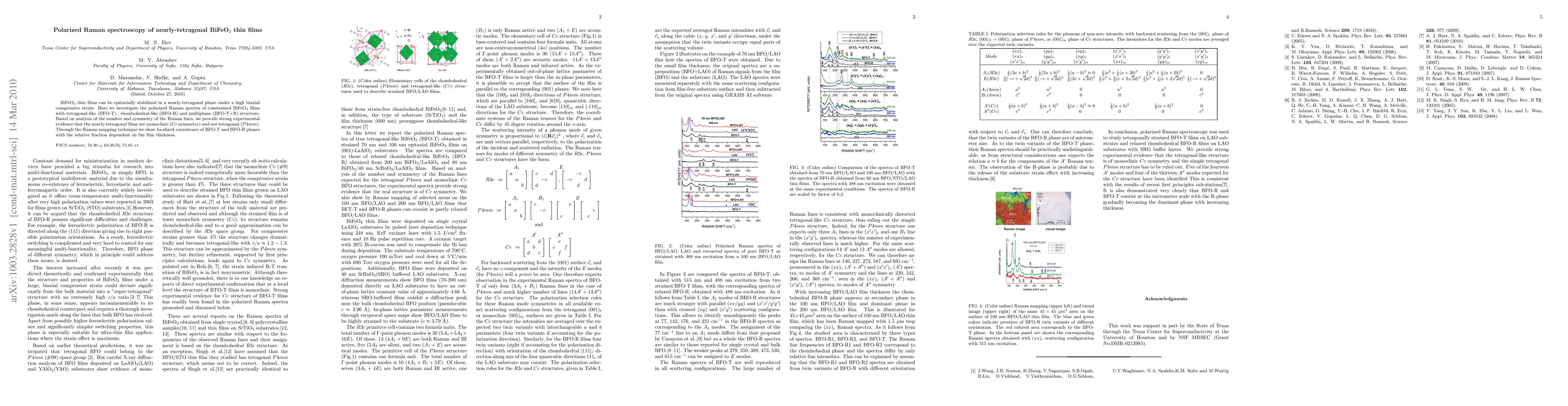 This research investigates polarized Raman spectroscopy of nearly-tetragonal BiFeO$_3$ thin films, revealing that these films are monoclinic ($Cc$ symmetry) rather than tetragonal. It also demonstrates localized coexistence of tetragonal and rhombohedral phases depending on film thickness.