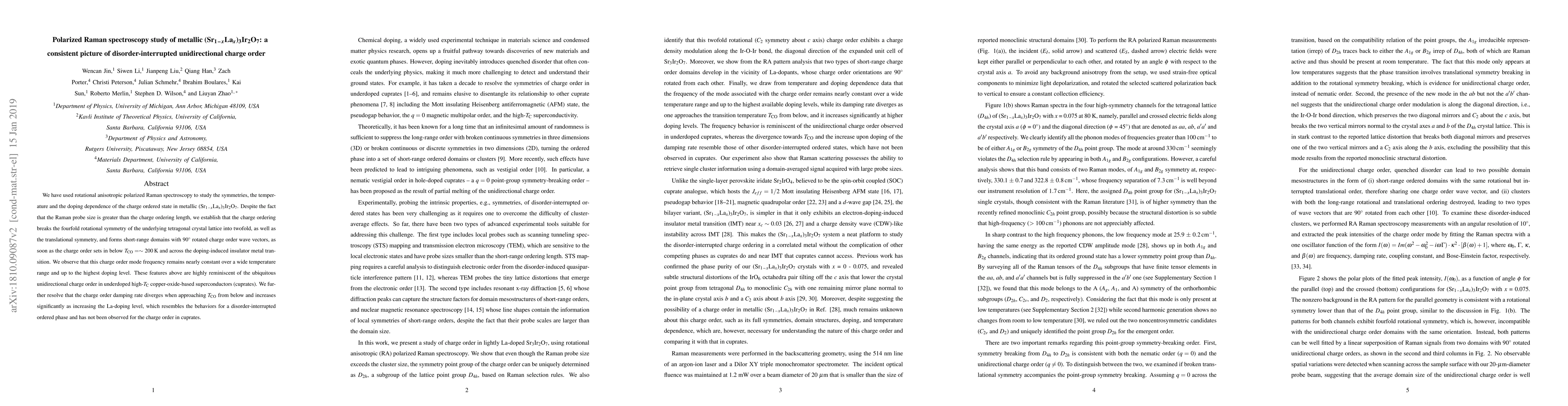 We have used rotational anisotropic polarized Raman spectroscopy to study the symmetries, the temperature and the doping dependence of the charge ordered state in metallic $(Sr_{1-x}La_{x})_{3}Ir_{2}O_{7}$. Although the Raman probe size is greater than the charge ordering length, we establish that the charge ordering breaks the fourfold rotational symmetry of the underlying tetragonal crystal lattice into twofold, as well as the translational symmetry, and forms short-range domains with $90^{\circ}$ rotated charge order wave vectors, as soon as the charge order sets in below $T_{CO} = \sim$ 200K and across the doping-induced insulator metal transition. We observe that this charge order mode frequency remains nearly constant over a wide temperature range and up to the highest doping level. These above features are highly reminiscent of the ubiquitous unidirectional charge order in underdoped high-$T_C$ copper-oxide-based superconductors (cuprates). We further resolve that the charge order damping rate diverges when approaching $T_{CO}$ from below and increases significantly as increasing the La doping level, which resembles the behaviors for a disorder-interrupted ordered phase and has not been observed for the charge order in cuprates.