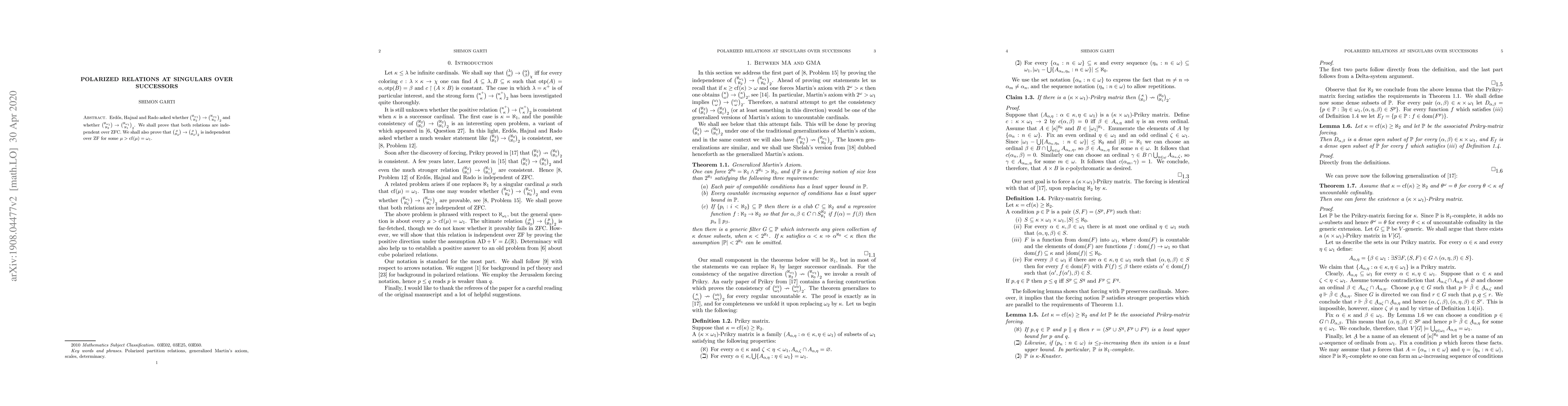 Erdos, Hajnal and Rado asked whether $\binom{\aleph_{\omega_1}}{\aleph_2}\rightarrow\binom{\aleph_{\omega_1}}{\aleph_0}_2$ and whether $\binom{\aleph_{\omega_1}}{\aleph_2}\rightarrow\binom{\aleph_{\omega_1}}{\aleph_1}_2$. We prove that both relations are independent over ZFC. We shall also prove that $\binom{\mu}{\aleph_2}\rightarrow\binom{\mu}{\aleph_2}_2$ is independent over ZF for some $\mu$ of cofinality $\omega_1$.