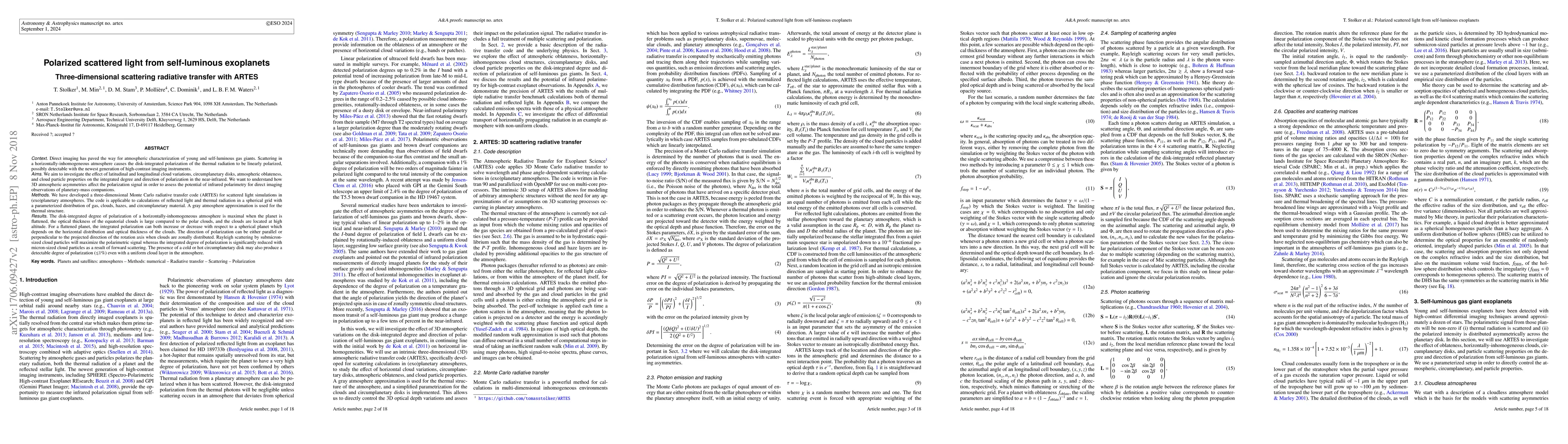 Direct imaging has paved the way for atmospheric characterization of young and self-luminous gas giants. Scattering in a horizontally-inhomogeneous atmosphere causes the disk-integrated polarization of the thermal radiation to be linearly polarized, possibly detectable with the newest generation of high-contrast imaging instruments. We aim to investigate the effect of latitudinal and longitudinal cloud variations, circumplanetary disks, atmospheric oblateness, and cloud particle properties on the integrated degree and direction of polarization in the near-infrared. We have developed a three-dimensional Monte Carlo radiative transfer code (ARTES) for scattered light simulations in (exo)planetary atmospheres. The code is applicable to calculations of reflected light and thermal radiation in a spherical grid with a parameterized distribution of gas, clouds, hazes, and circumplanetary material. The disk-integrated degree of polarization of a horizontally-inhomogeneous atmosphere is maximal when the planet is flattened, the optical thickness of the equatorial clouds is large compared to the polar clouds, and the clouds are located at high altitude. For a flattened planet, the integrated polarization can both increase or decrease with respect to a spherical planet which depends on the horizontal distribution and optical thickness of the clouds. The direction of polarization can be either parallel or perpendicular to the projected direction of the rotation axis when clouds are zonally distributed. Rayleigh scattering by submicron-sized cloud particles will maximize the polarimetric signal whereas the integrated degree of polarization is significantly reduced with micron-sized cloud particles as a result of forward scattering. The presence of a cold or hot circumplanetary disk may also produce a detectable degree of polarization ($\lesssim$1%) even with a uniform cloud layer in the atmosphere.
