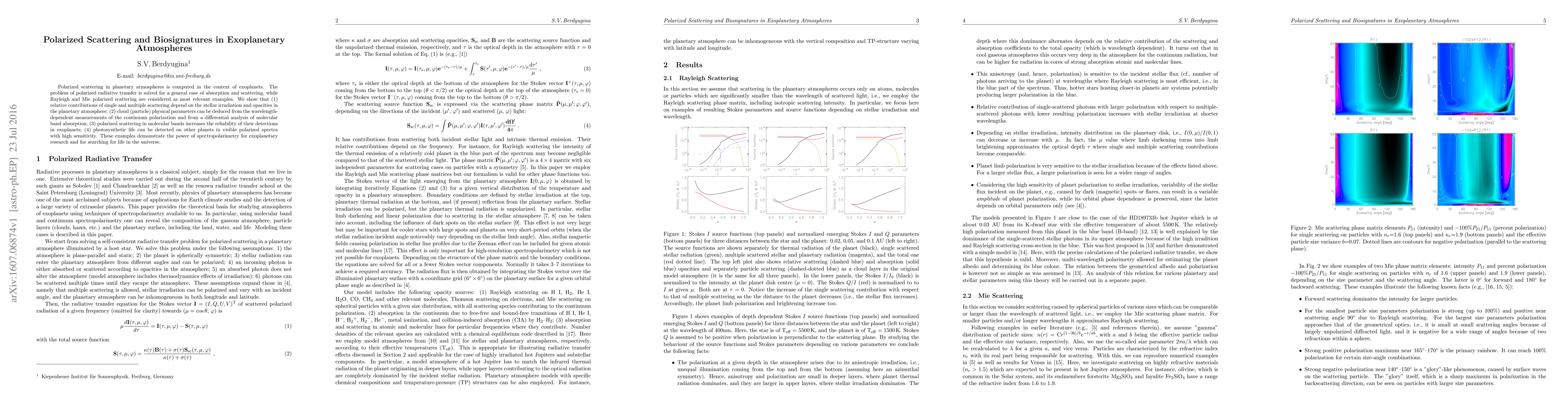 This paper investigates polarized scattering in exoplanetary atmospheres, demonstrating that spectropolarimetry can reveal cloud parameters and enhance the detection of molecular signatures, including potential biosignatures from photosynthetic life. The study highlights the importance of polarized scattering for understanding exoplanetary atmospheres and the search for life.