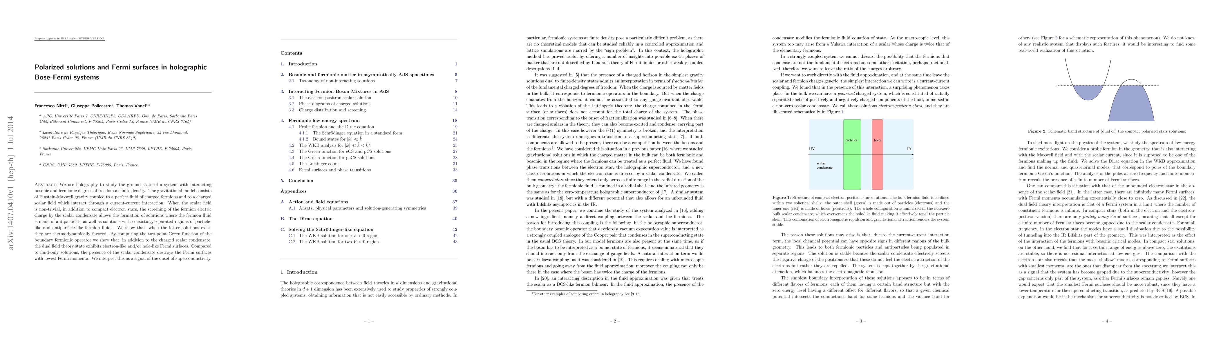 We use holography to study the ground state of a system with interacting bosonic and fermionic degrees of freedom at finite density. The gravitational model consists of Einstein-Maxwell gravity coupled to a perfect fluid of charged fermions and to a charged scalar field which interact through a current-current interaction. When the scalar field is non-trivial, in addition to compact electron stars, the screening of the fermion electric charge by the scalar condensate allows the formation of solutions where the fermion fluid is made of antiparticles, as well as solutions with coexisting, separated regions of particle-like and antiparticle-like fermion fluids. We show that, when the latter solutions exist, they are thermodynamically favored. By computing the two-point Green function of the boundary fermionic operator we show that, in addition to the charged scalar condensate, the dual field theory state exhibits electron-like and/or hole-like Fermi surfaces. Compared to fluid-only solutions, the presence of the scalar condensate destroys the Fermi surfaces with lowest Fermi momenta. We interpret this as a signal of the onset of superconductivity.