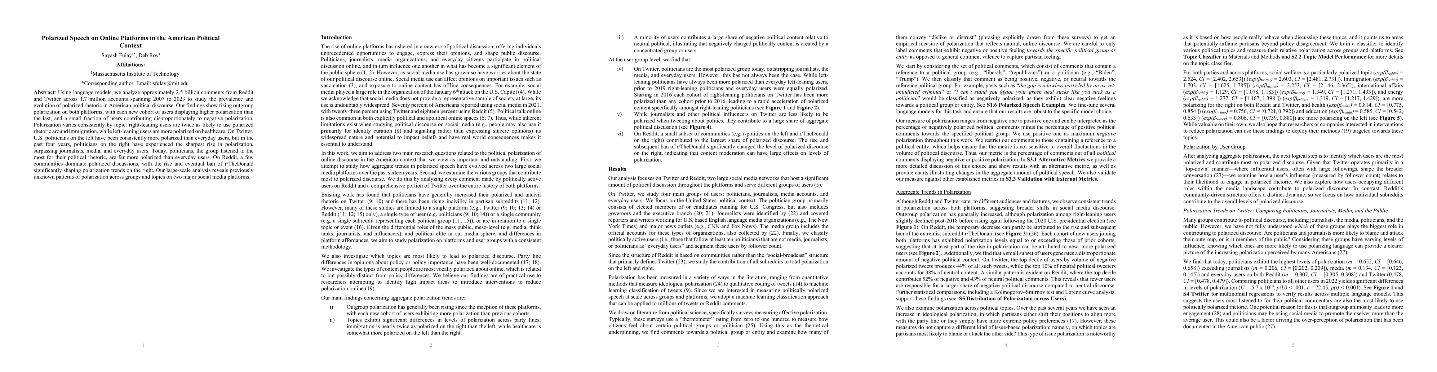 While political polarization has increased as measured through surveys, currently we lack comprehensive, longitudinal, and ecologically valid measurement of the polarization of online political speech that spans social media platforms. Using language models, we analyze ~2.5 billion comments on Reddit and Twitter across ~1.7 million accounts from 2007-2023 and find that polarized speech has been rising on both platforms since their inception, with outgroup polarization levels higher on Twitter than Reddit. On Twitter, while U.S. politicians on the left have been consistently more polarized than everyday users, politicians on the right experienced the highest growth in polarization, overtaking journalists, media, and everyday users over the past four years. Today, politicians, the group listened to the most for their political rhetoric, are far more polarized than everyday users. Additionally, while polarized speech is typically lower for accounts with more followers, right-leaning political influencers are an exception to this trend, which may influence perceptions of polarization on the left versus the right. Polarization is more diffuse across users on Twitter than on Reddit, where it is localized to a few communities. Polarization also varies by topic, with right-leaning users twice as likely to use polarized rhetoric about immigration as left-leaning users while left-leaning users are somewhat more likely to be polarized around healthcare. Our large-scale analysis reveals previously unknown patterns of polarization across platforms, groups, and topics that will help us better contextualize polarized content and potentially intervene to reduce it.