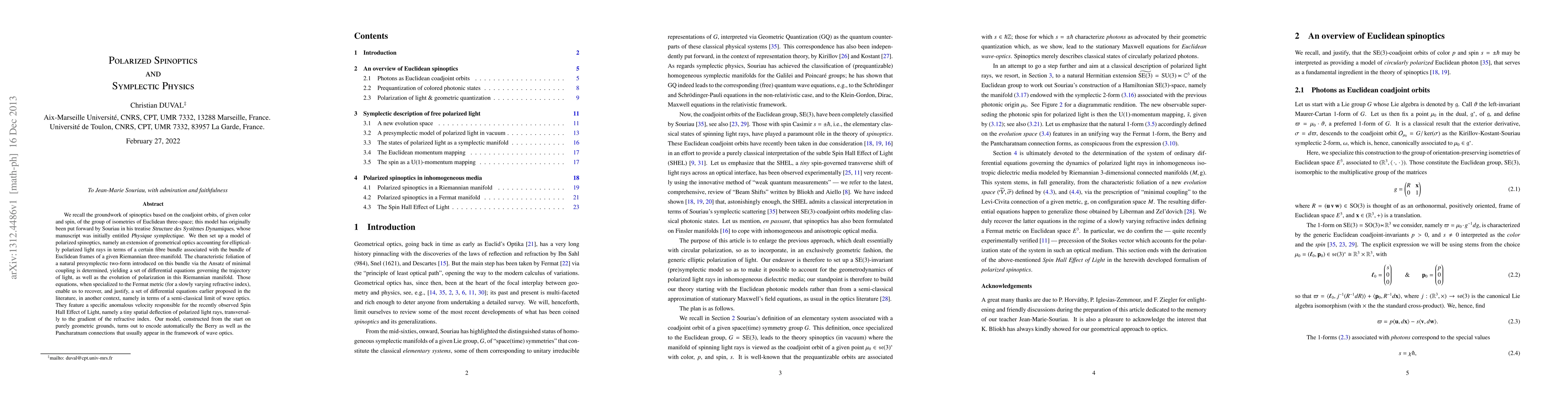 We recall the groundwork of spinoptics based on the coadjoint orbits, of given color and spin, of the group of isometries of Euclidean three-space; this model has originally been put forward by Souriau in his treatise "Structure des Syst\'emes Dynamiques", whose manuscript was initially entitled "Physique symplectique". We then set up a model of polarized spinoptics, namely an extension of geometrical optics accounting for elliptically polarized light rays in terms of a certain fibre bundle associated with the bundle of Euclidean frames of a given Riemannian three-manifold. The characteristic foliation of a natural presymplectic two-form introduced on this bundle via the Ansatz of minimal coupling is determined, yielding a set of differential equations governing the trajectory of light, as well as the evolution of polarization in this Riemannian manifold. Those equations, when specialized to the Fermat metric (for a slowly varying refractive index), enable us to recover, and justify, a set of differential equations earlier proposed in the literature, in another context, namely in terms of a semi-classical limit of wave optics. They feature a specific anomalous velocity responsible for the recently observed Spin Hall Effect of Light, namely a tiny spatial deflection of polarized light rays, transversally to the gradient of the refractive index. Our model, constructed from the start on purely geometric grounds, turns out to encode automatically the Berry as well as the Pancharatnam connections that usually appear in the framework of wave optics.