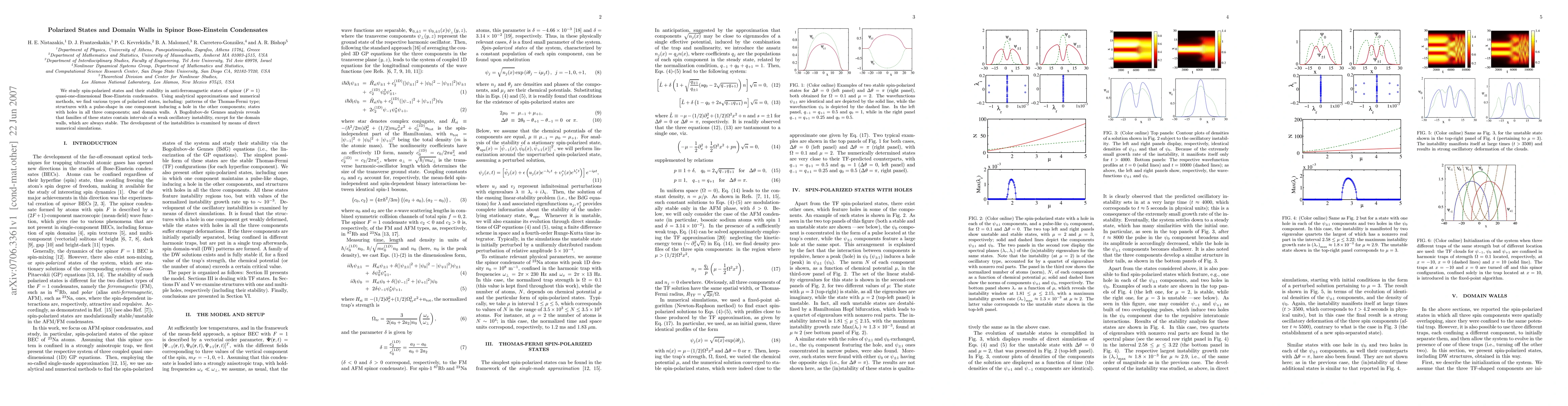 This paper investigates polarized states and domain walls in quasi-one-dimensional spinor Bose-Einstein condensates, identifying various structures including Thomas-Fermi patterns and hole-inducing pulses. It finds that all polarized states exhibit weak oscillatory instability, except for domain walls, which remain stable, as confirmed by numerical simulations.
