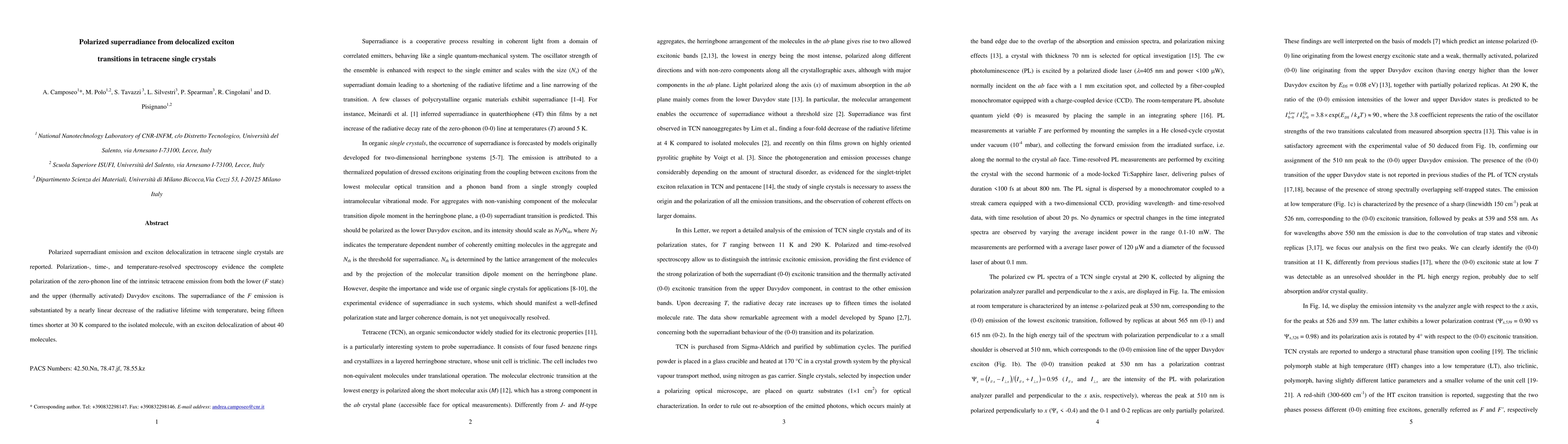 This paper reports on polarized superradiant emission from delocalized excitons in tetracene single crystals, demonstrating the complete polarization of the zero-phonon line of intrinsic tetracene emission. The superradiance is characterized by a significant decrease in radiative lifetime with temperature, indicating exciton delocalization over approximately 40 molecules.