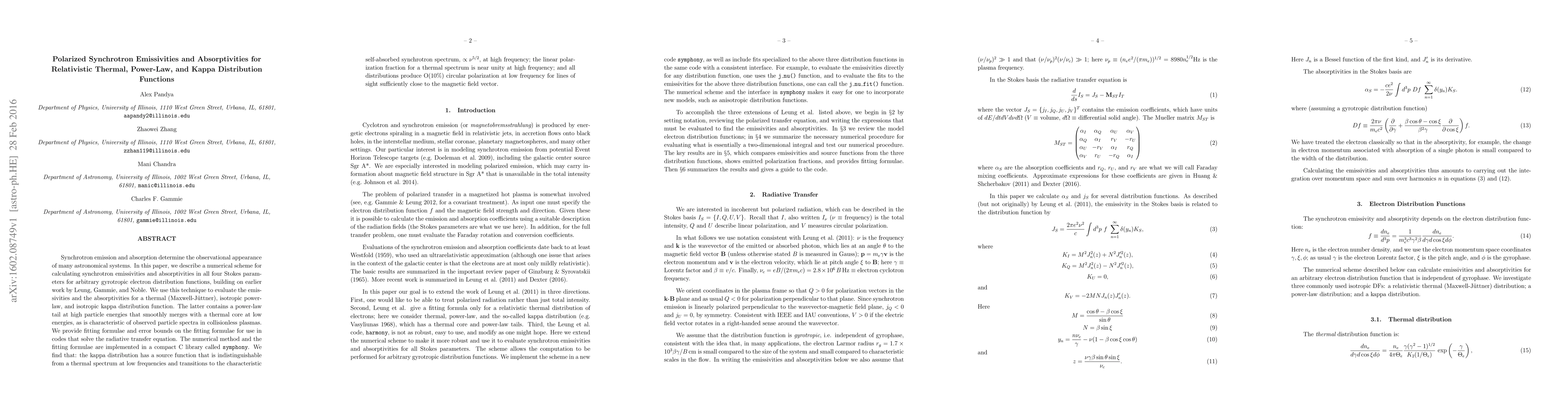 This paper presents a numerical scheme for calculating synchrotron emissivities and absorptivities for various electron distribution functions, including thermal, power-law, and kappa distributions. The results show that kappa distributions transition from thermal-like to self-absorbed spectra at high frequencies, and all distributions produce significant circular polarization at low frequencies.