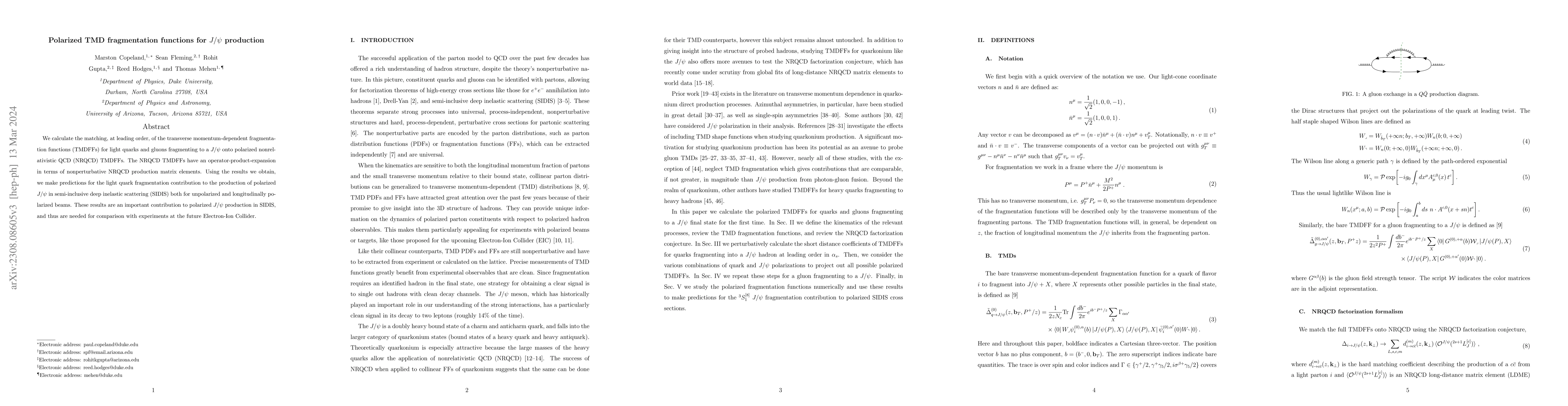 We calculate the matching, at leading order, of the transverse momentum-dependent fragmentation functions (TMDFFs) for light quarks and gluons fragmenting to a $J/\psi$ onto polarized nonrelativistic QCD (NRQCD) TMDFFs. The NRQCD TMDFFs have an operator-product-expansion in terms of nonperturbative NRQCD production matrix elements. Using the results we obtain, we make predictions for the light quark fragmentation contribution to the production of polarized $J/\psi$ in semi-inclusive deep inelastic scattering (SIDIS) both for unpolarized and longitudinally polarized beams. These results are an important contribution to polarized $J/\psi$ production in SIDIS, and thus are needed for comparison with experiments at the future Electron-Ion Collider.